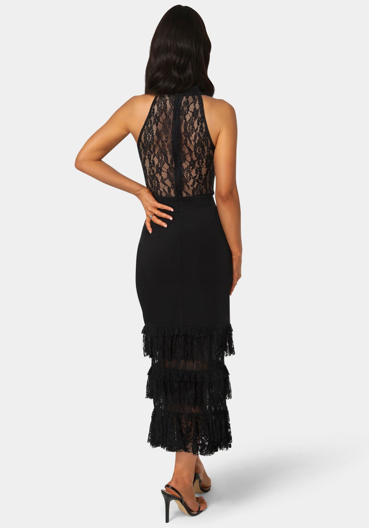 Halter tiered lace midi with flirt built in. Wedding guest perfection, garden parties, and candlelit dinners you arrive to fashionably late.