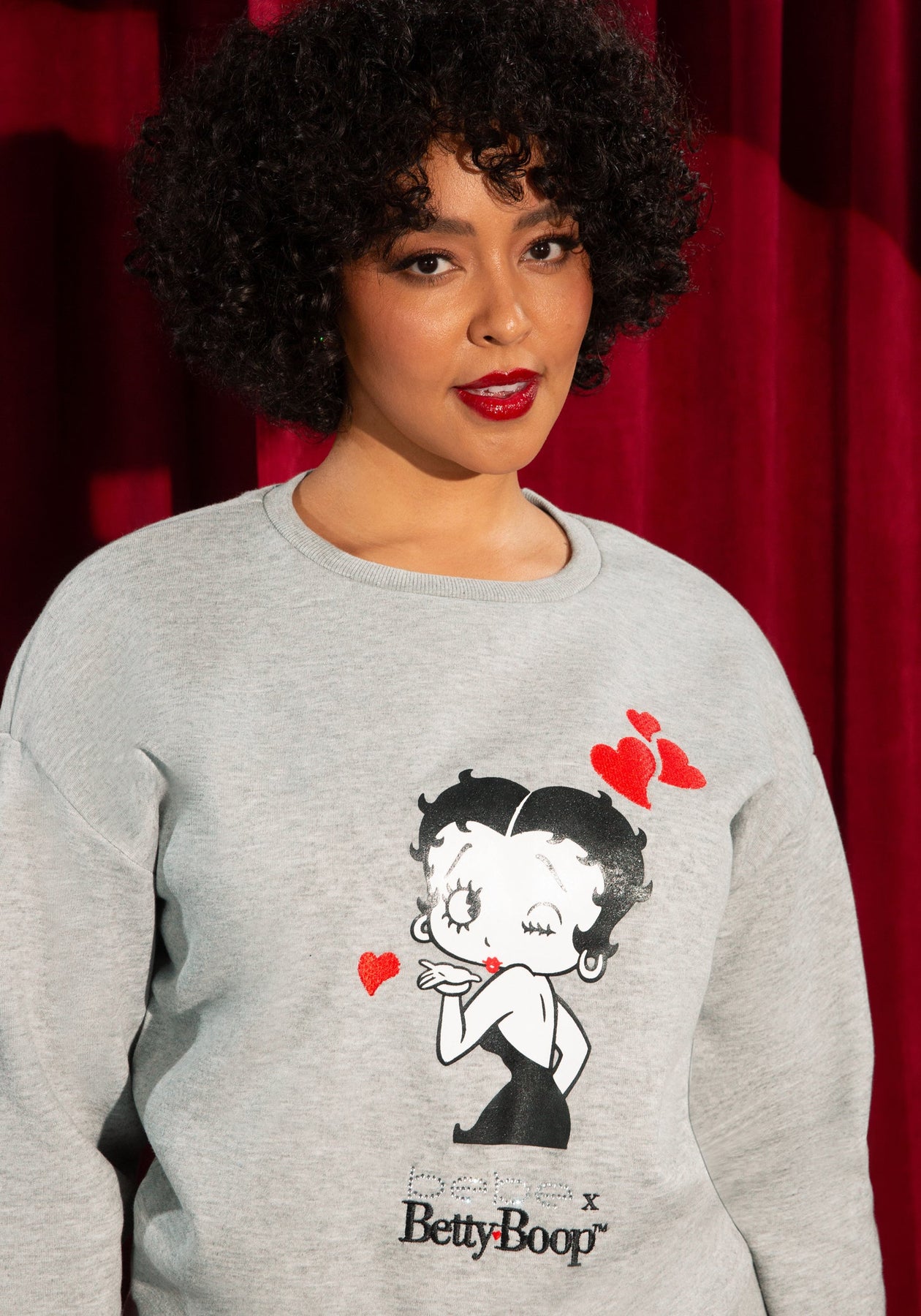 Comfy but make it a little flirty. The Bebe x Betty Boop collection pullover features a Betty graphic on the front, serving cozy with a side of legacy. Wear for travel days, coffee runs, and “I might go out” energy.