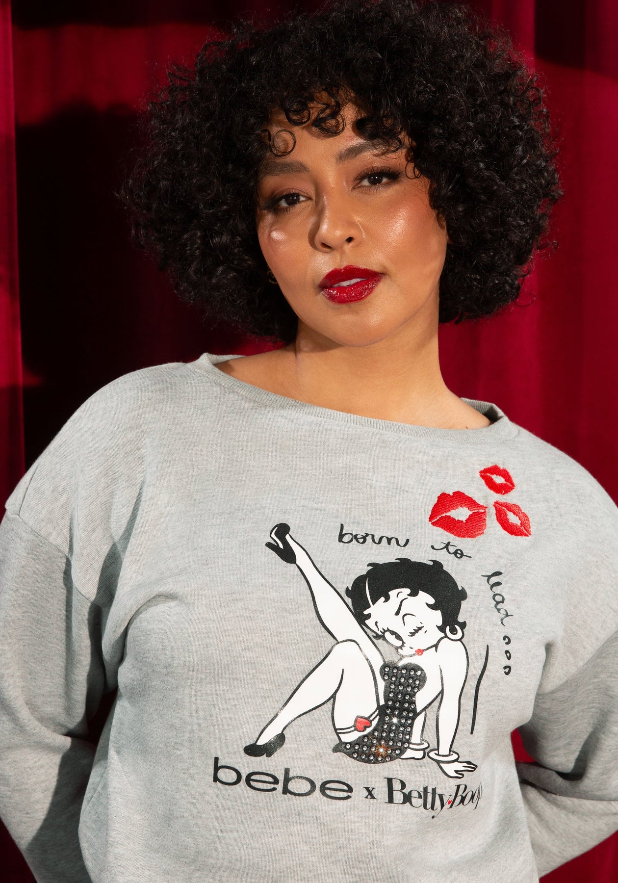Comfy but make it a little flirty. The Bebe x Betty Boop collection pullover features a Betty graphic on the front, serving cozy with a side of legacy. Wear for travel days, coffee runs, and “I might go out” energy.