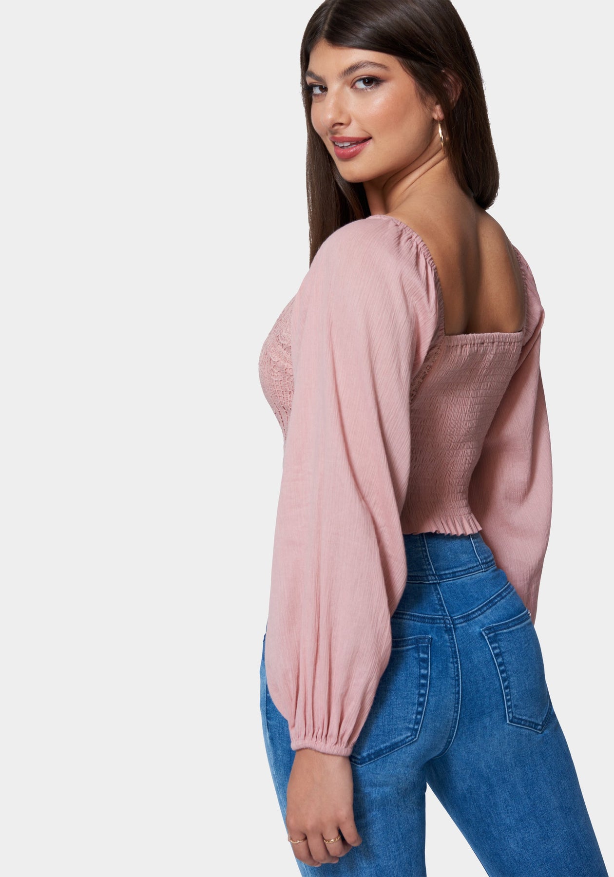 Dreaming of summer. This woven top features a soft crochet design and scalloped trim throughout, a square neckline, and long puff sleeves for the ultimate cottage-core dream.