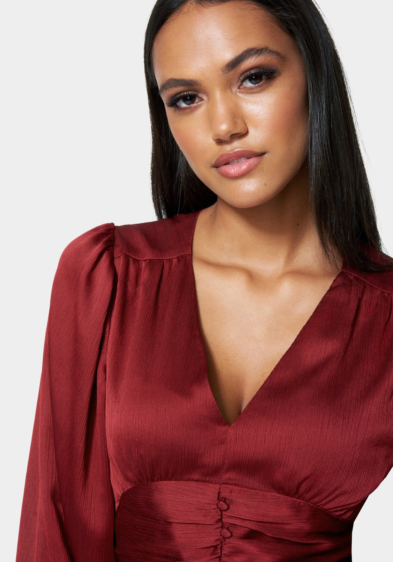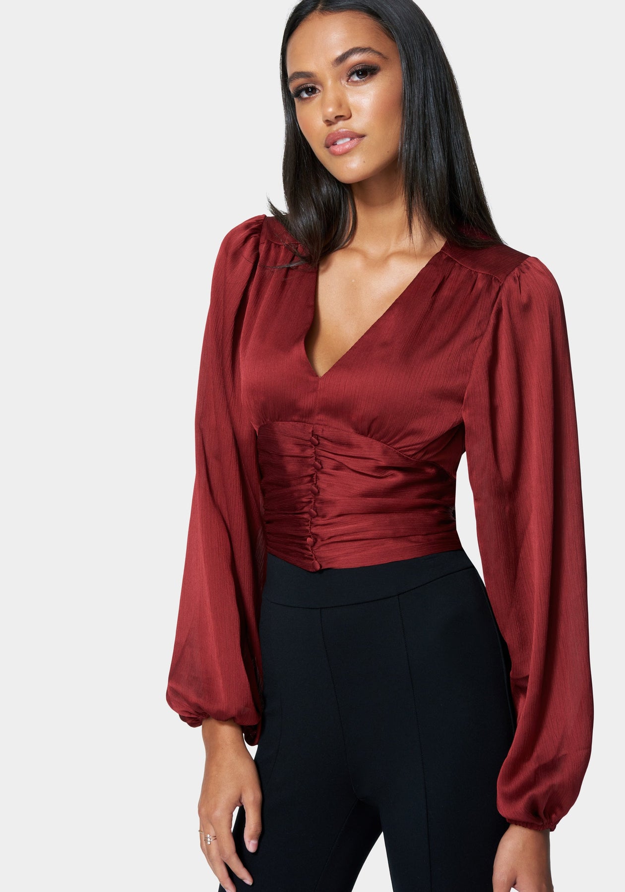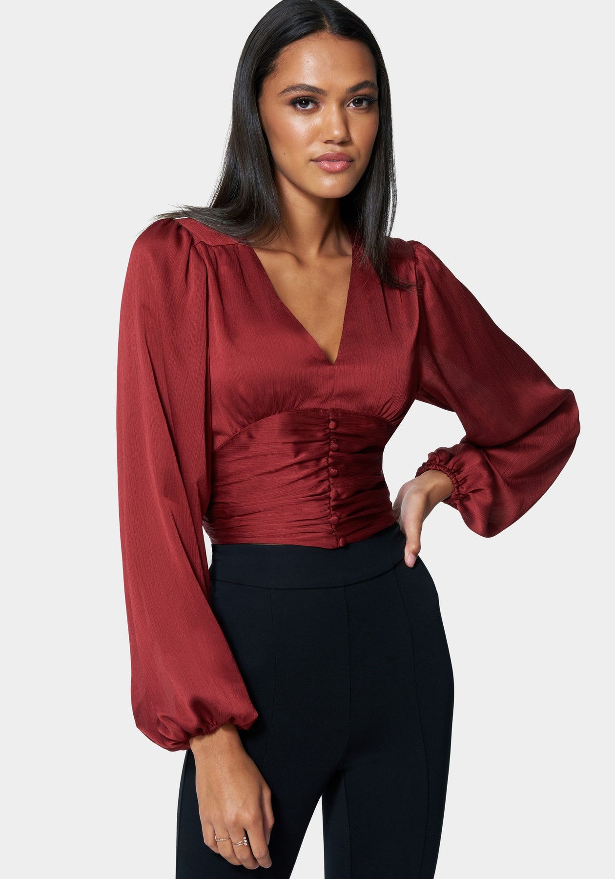 True romance. This silky-satin top features a deep V-neckline, ruching along the waist with button detailing, long lantern sleeves, and a cropped fit. Pairs well with pants and skirts.