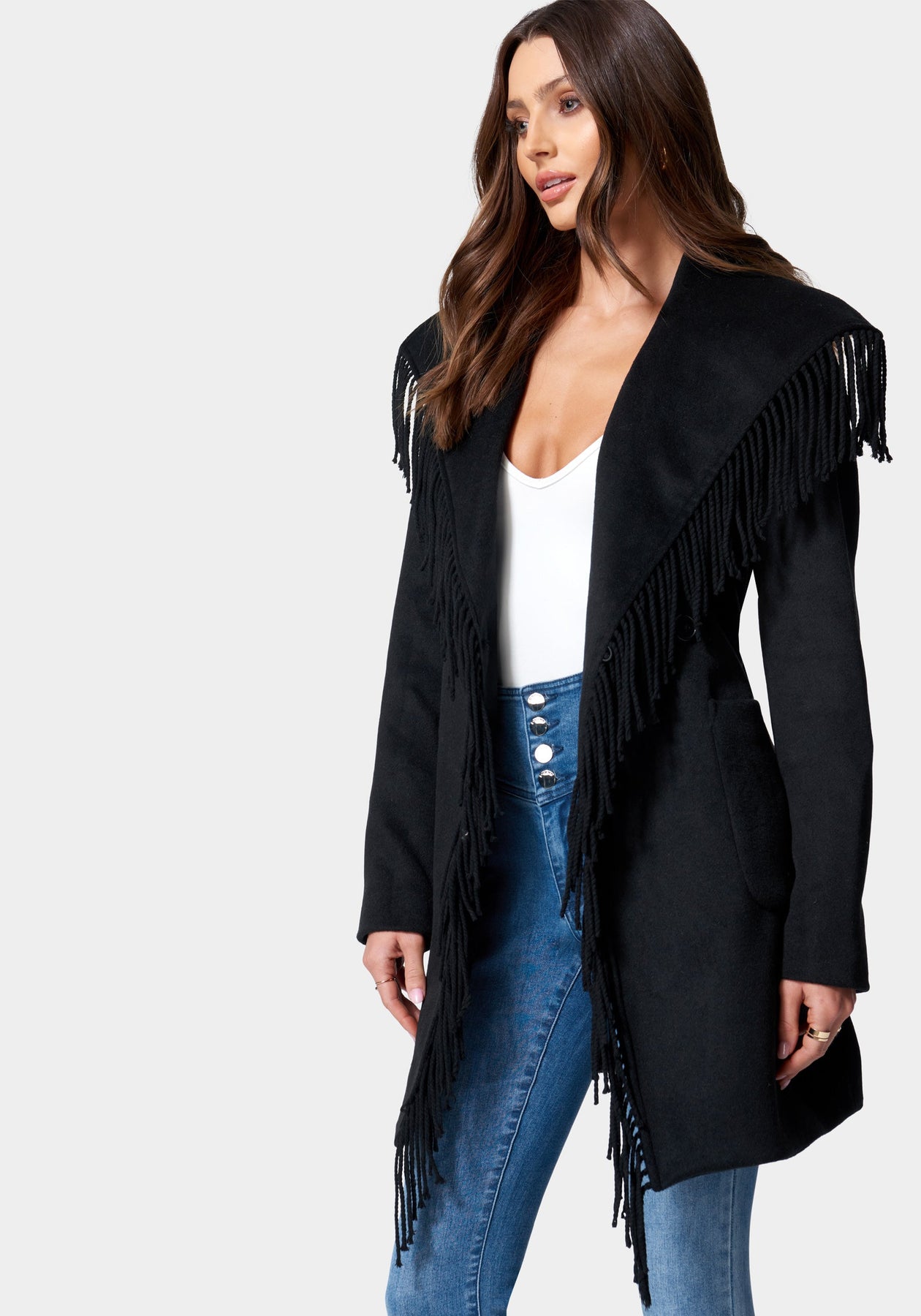 Boho inspired fringe tops this mid-weight wrap coat for a laid back luxe. Complete with a wide collar, button closure, slip pockets and a belted waist, this coat is the perfect addition to any fall wardrobe.