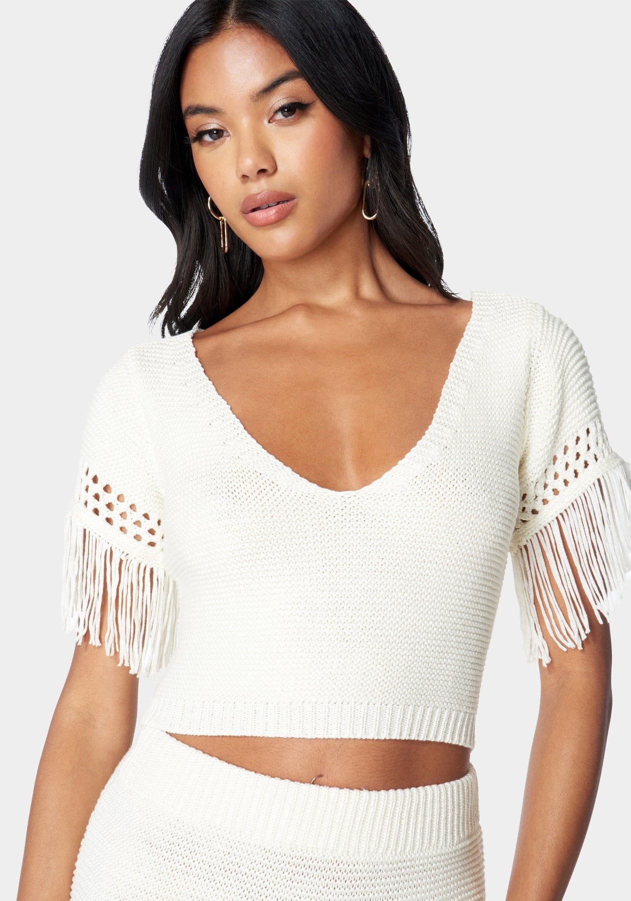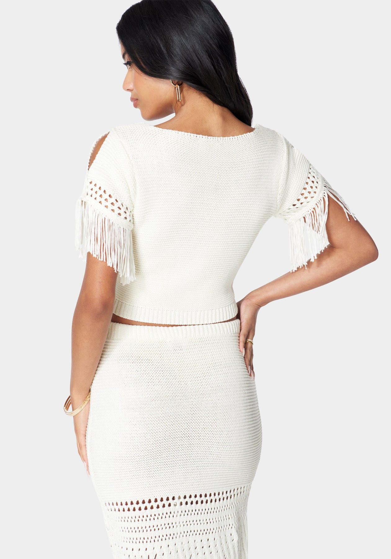 A short-sleeve, cropped sweater features boho-inspired fringe details and an ultra comfortable knit fabric. Pair with its matching white midi skirt and bebe heels to complete the look.