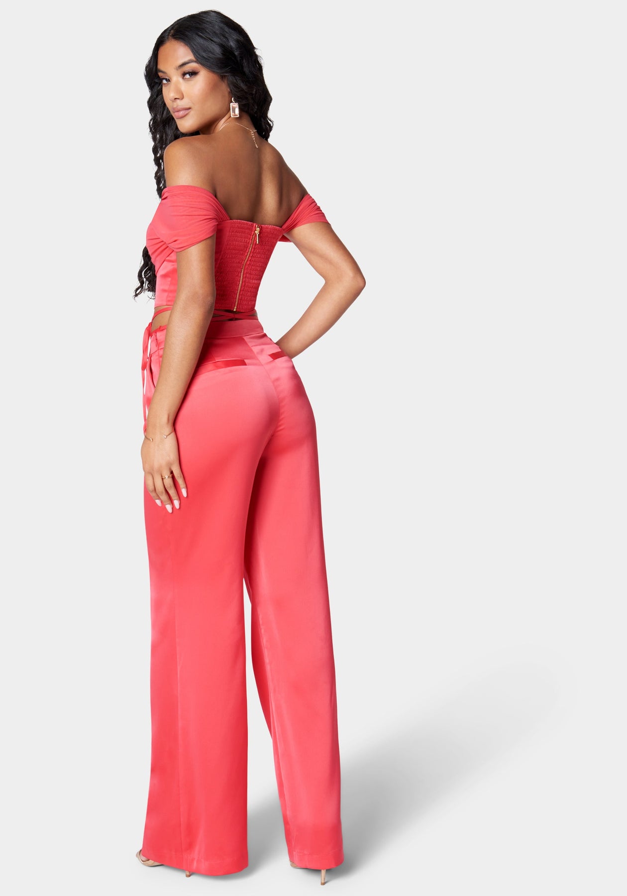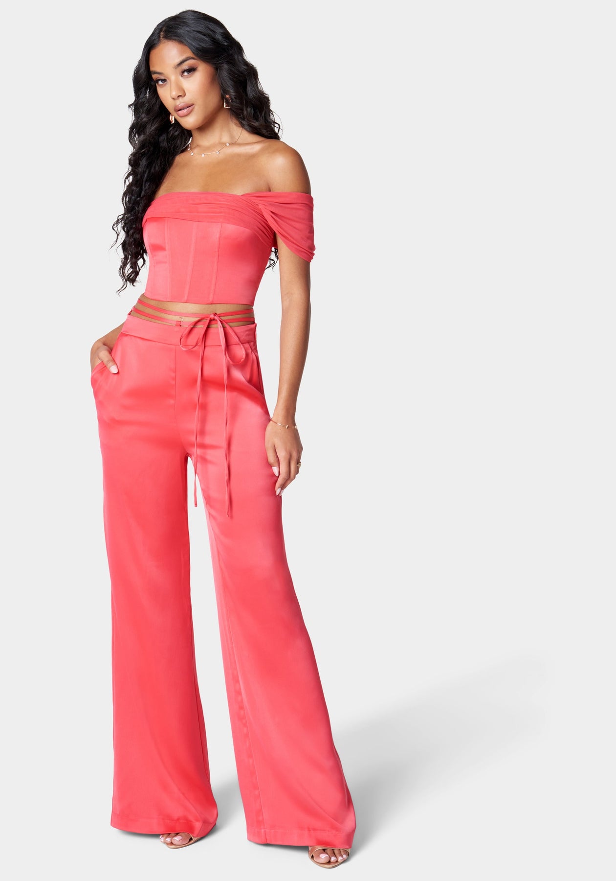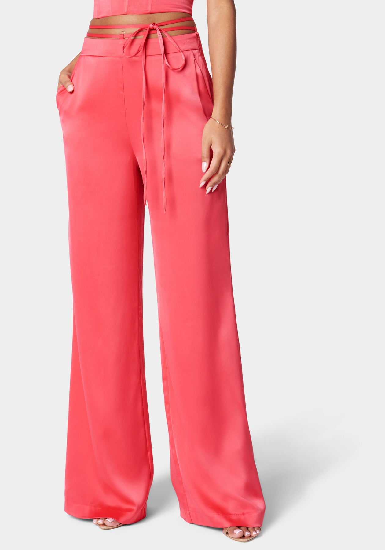 A high waist palazzo pant features an on-trend waist side tie detail. Pair with your favorite corset top to complete the look.