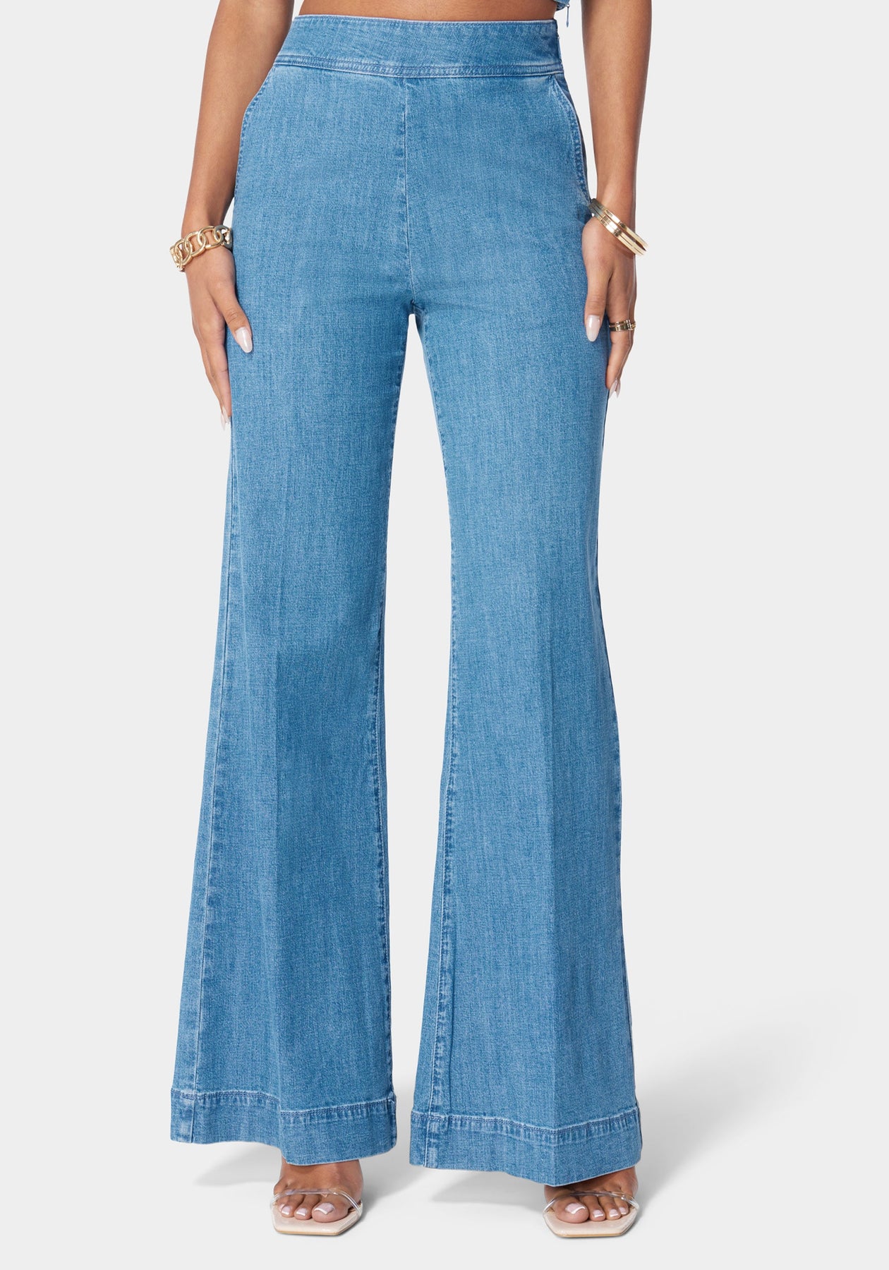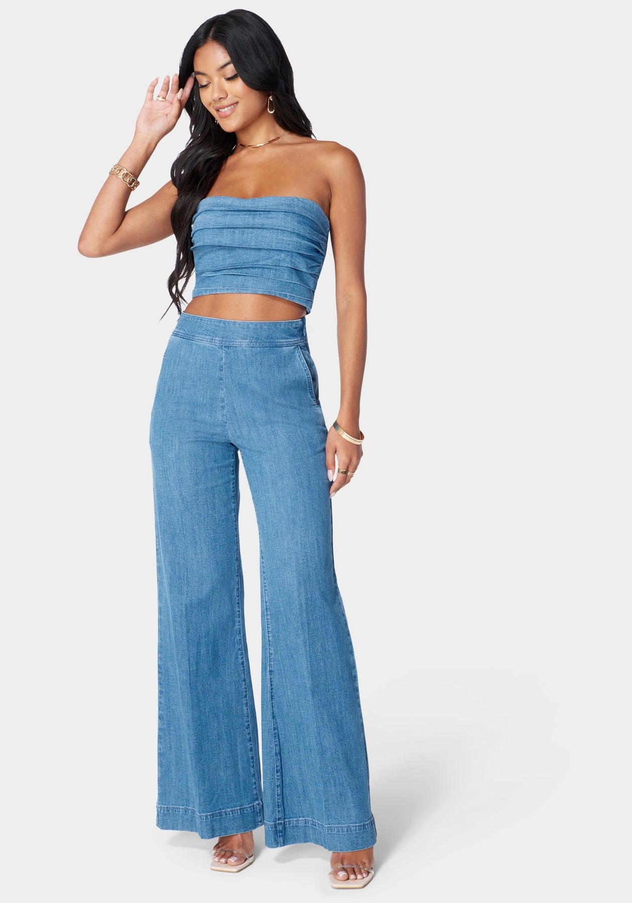 Throw it back in style with a high waist denim pant that features a retro wide leg silhouette. This denim is ultra versatile: keep it casual with sneakers and a knit halter top or dress it up for brunch with a matching denim bandeau top and heels.