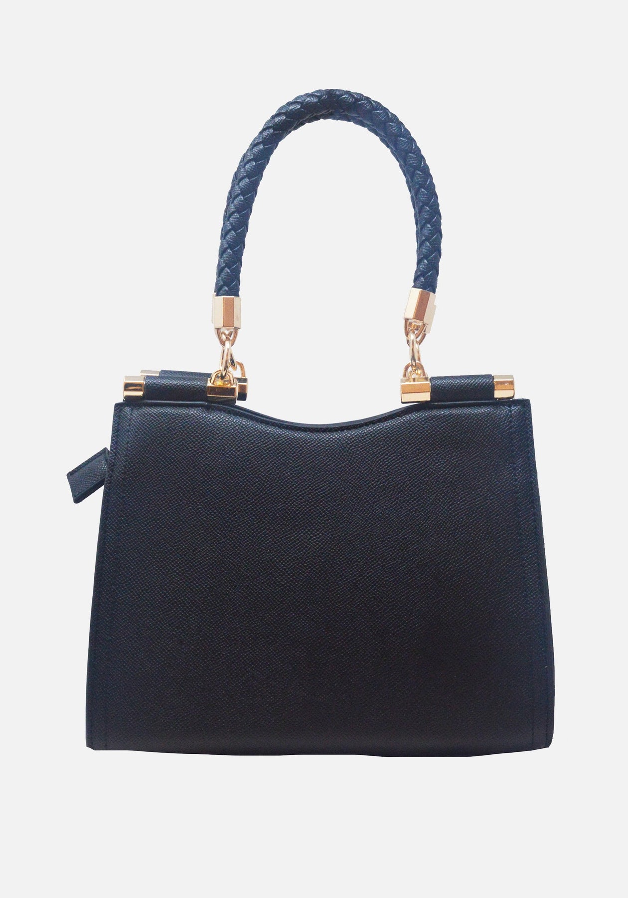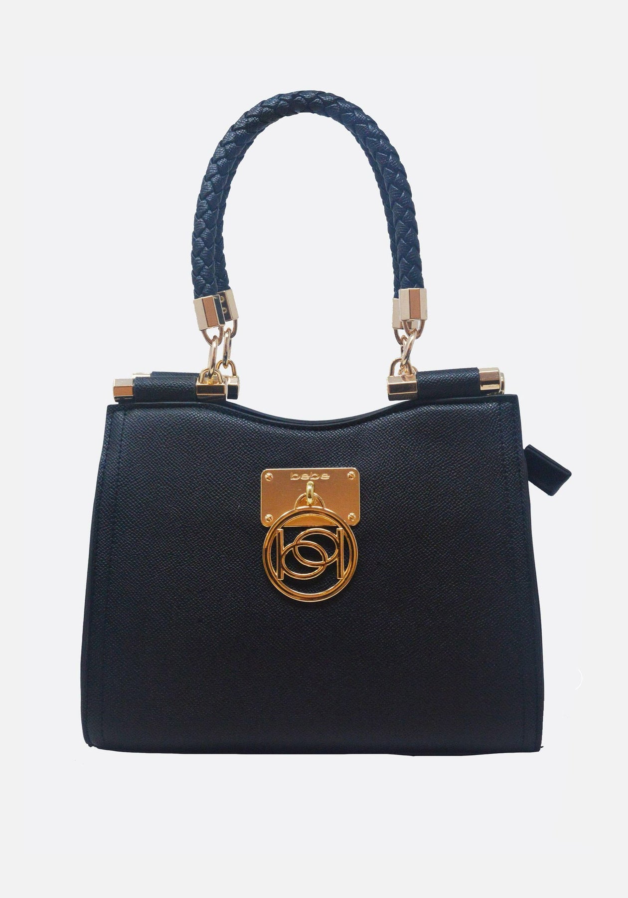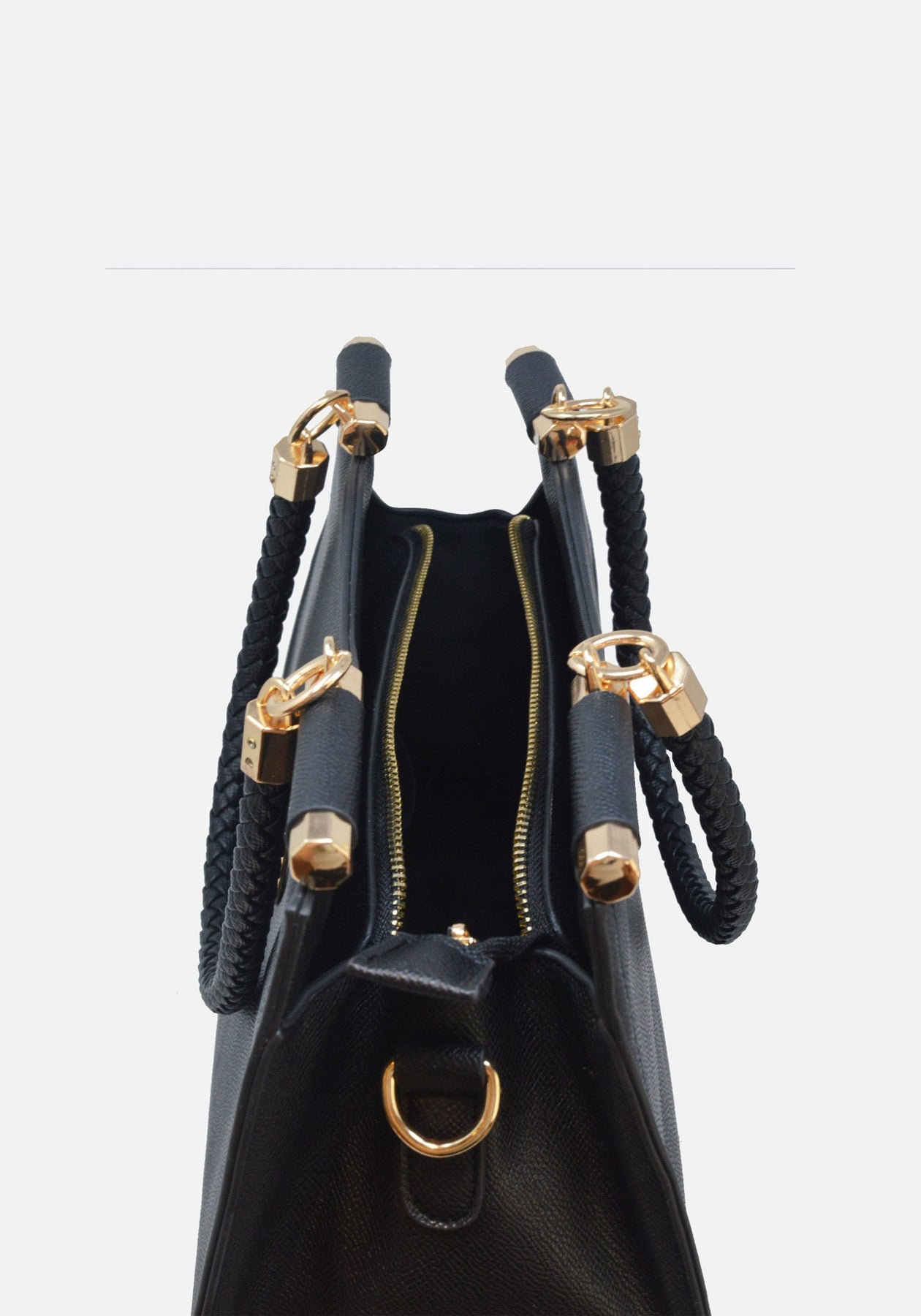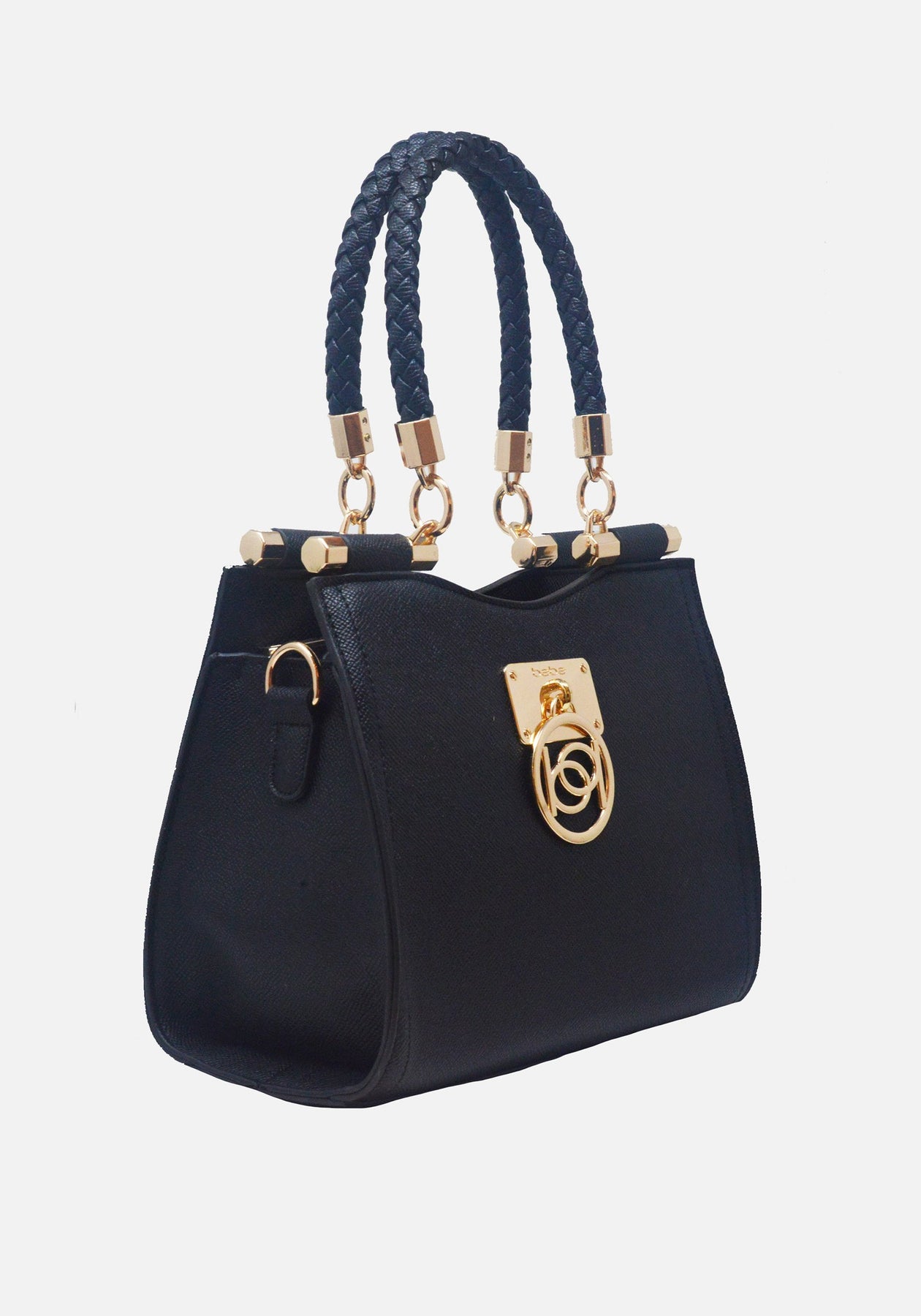 The perfect shopping companion is a stylish bag. This mini shopper bag features braided rope top handles, a detachable crossbody strap, and charm logo plate detail.