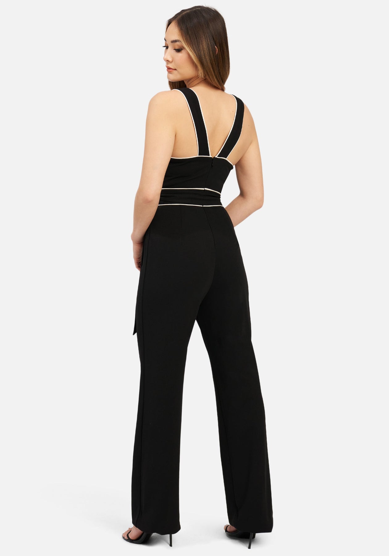 Knit Crepe Jumpsuit W/ Front Cutout & Contrast Piping