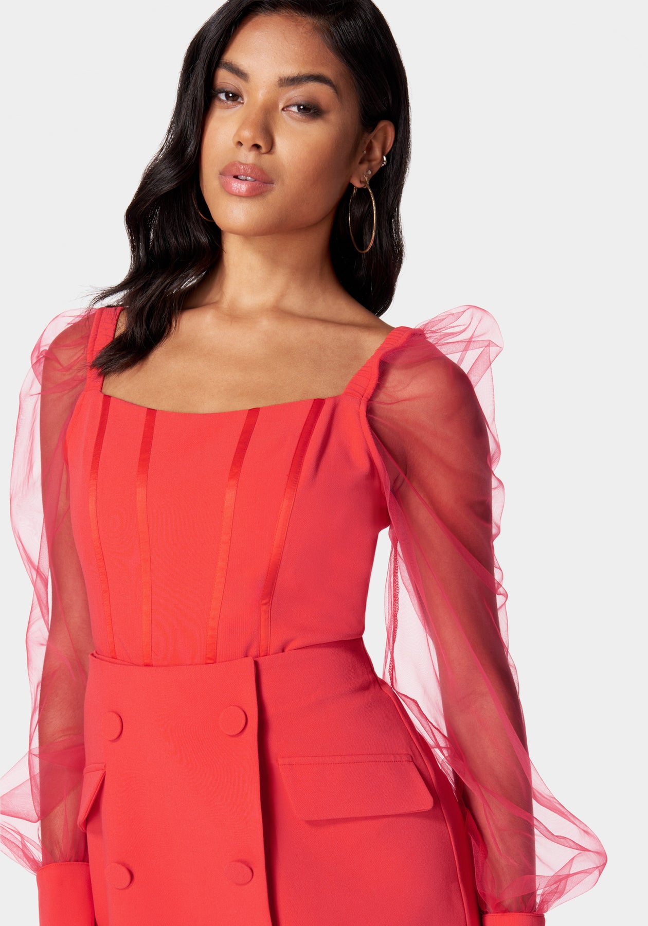 Reveal your fashion-forward style with our mesh sleeves corset illusion tailored romper. With mesh sleeves and a corset illusion, this romper delivers an ultra-modern, playful look. The tailored waistline flatters your figure while creating a sleek silhouette.