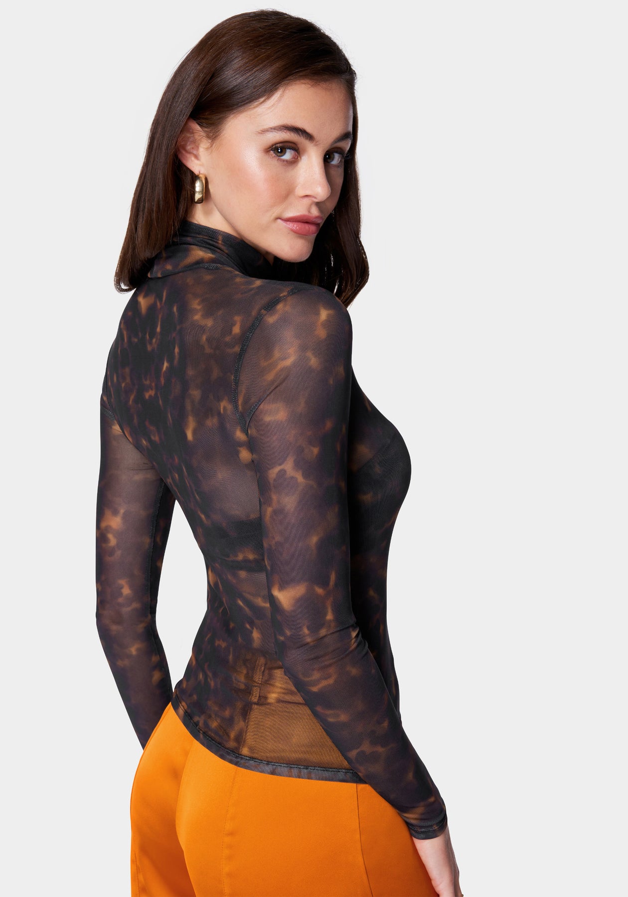 Exude daring sophistication with our mock neck printed mesh top. This statement piece features a chic print on a sheer mesh fabric, adding a captivating allure to your nightlife ensemble. Pair it with a stylish inner layer (or not) for a bold, fashionable look.