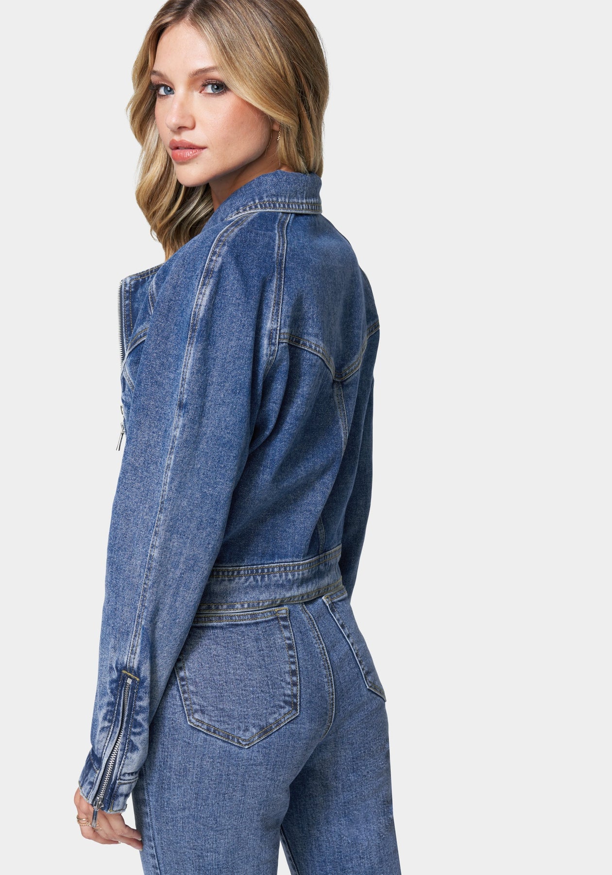 Your perfect layering piece. Pair this Moto Denim Jacket over your favorite tops this fall and complete the look with jeans for the ultimate style. Made in vintage stretch denim featuring a moto look with zipper detail.
