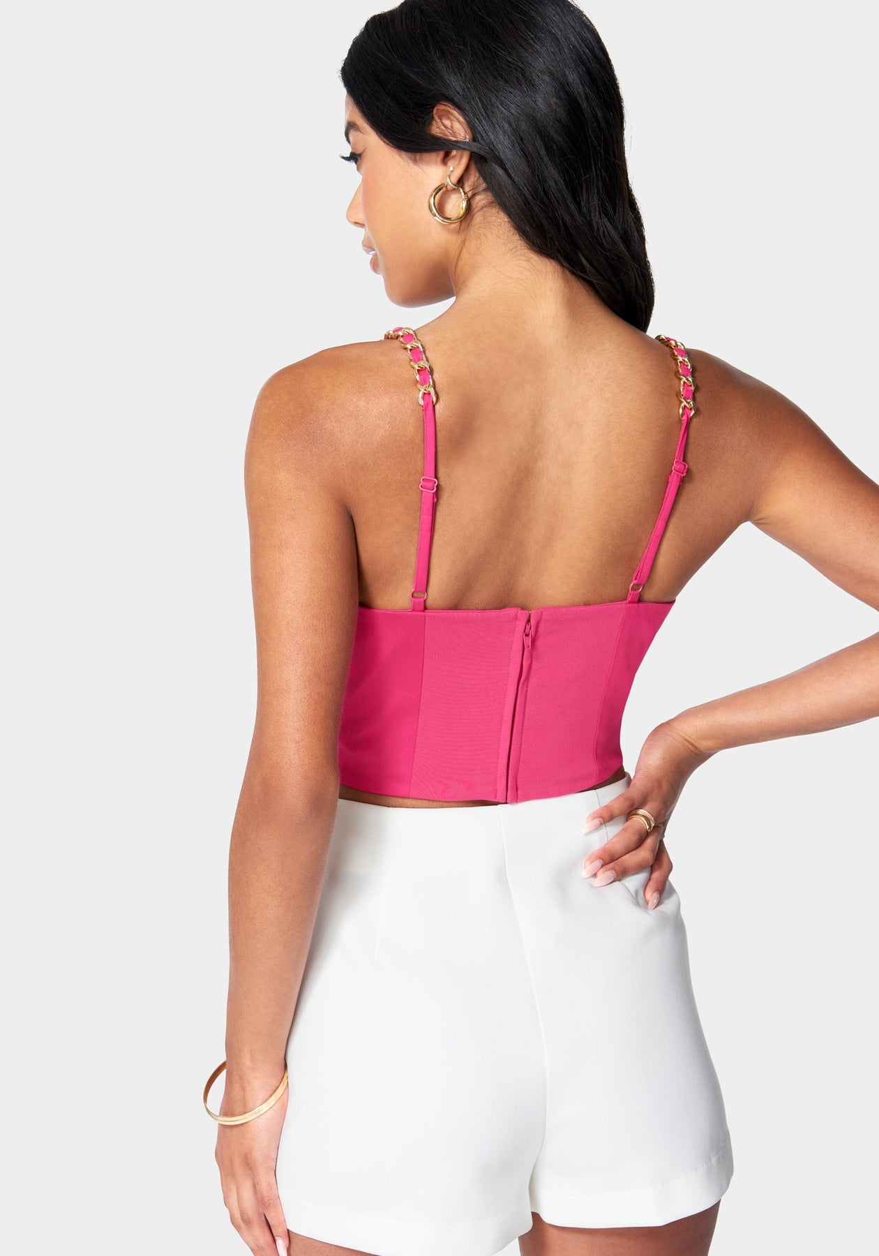 A gorgeous pink pleated top features chain straps that add a playful edge to your look. Pair with pink pants for a matching set or your favorite bebe denim.