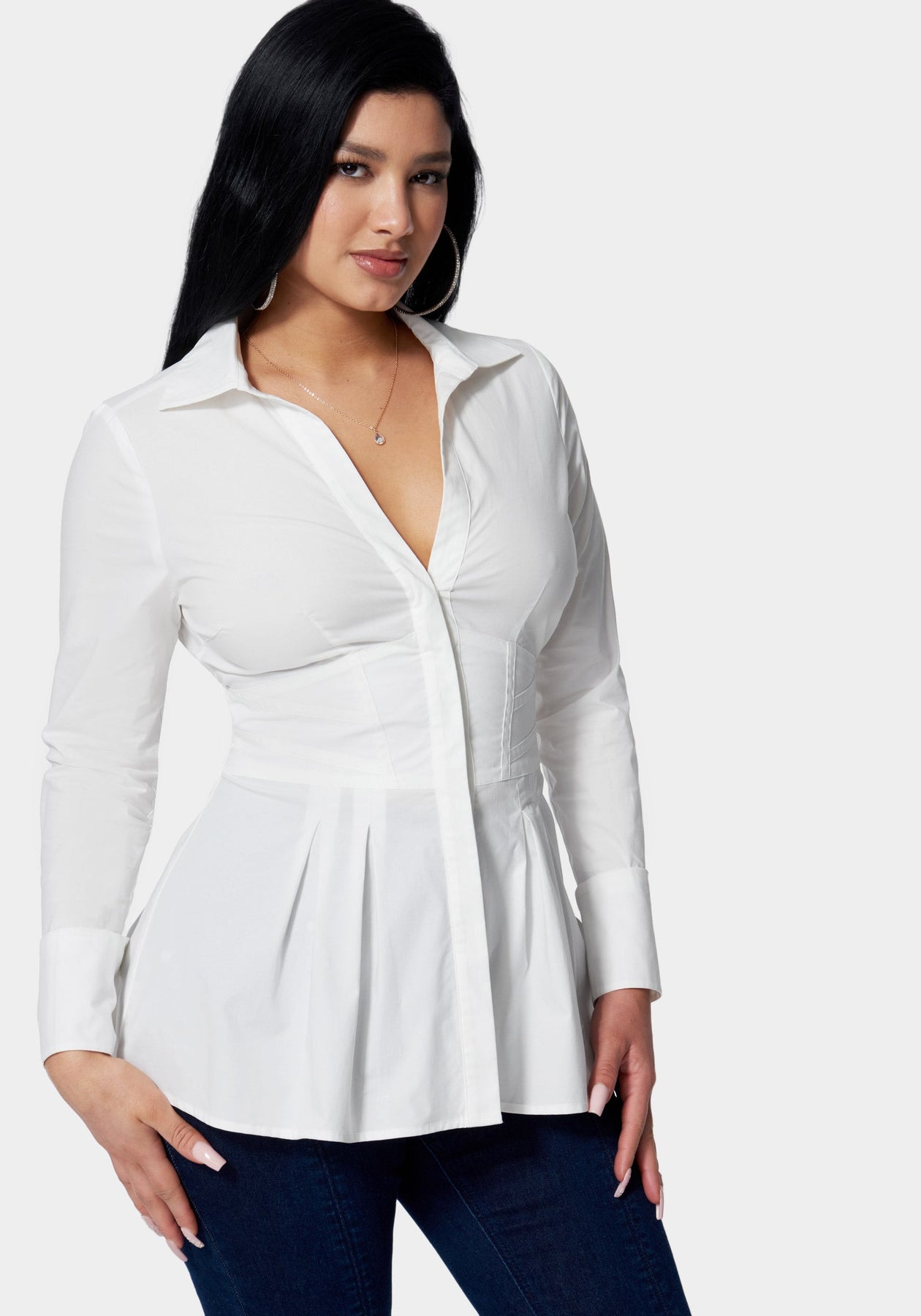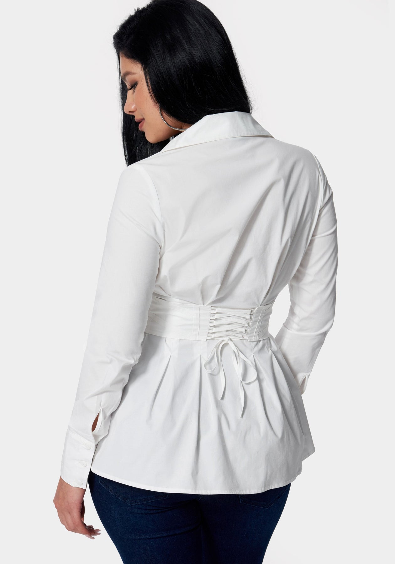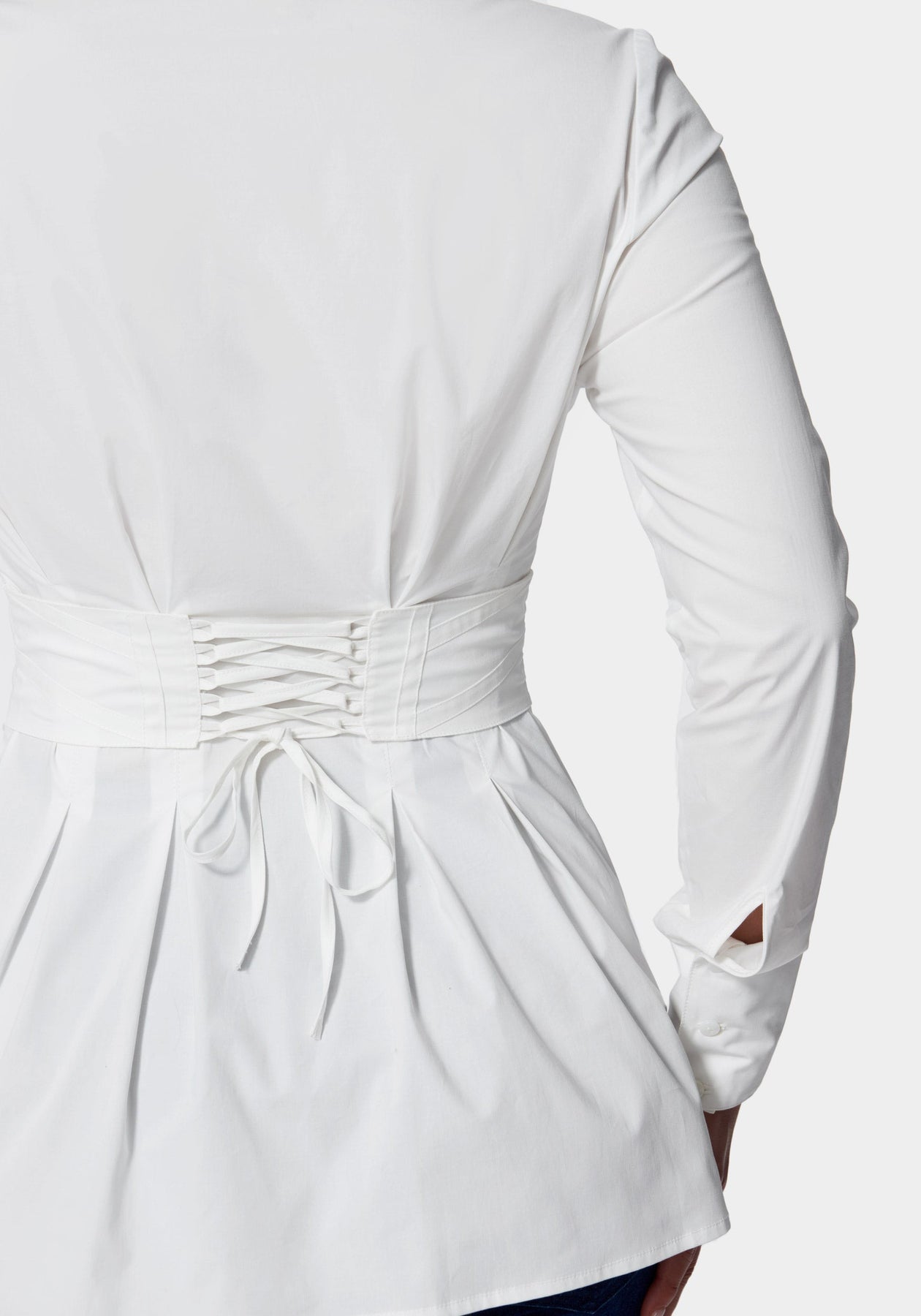 Details, please. This is a longline poplin top featuring a cinched waist with lace-up details, a plunge neckline, and finished with a shirt collar. Pairs well with denim or tailored pants.