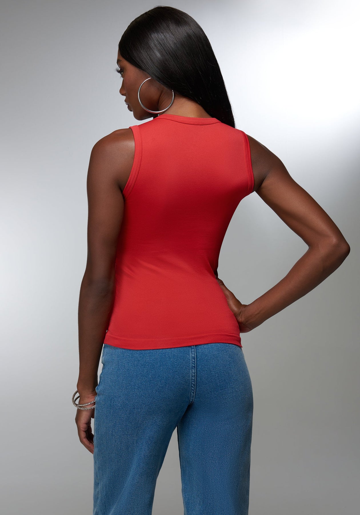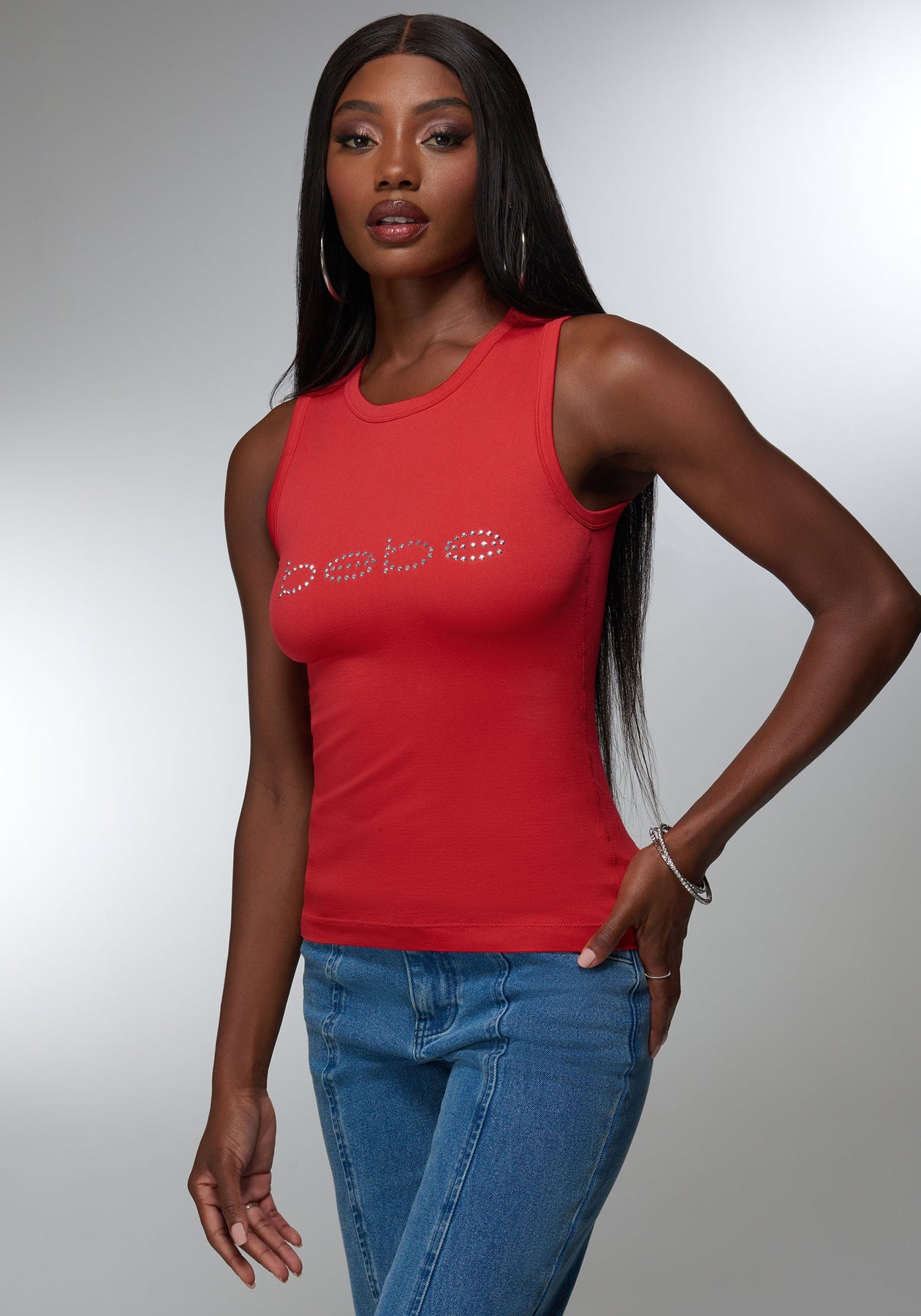 Double the style with this tank top featuring a unique double front and glittering rhinestone logo. It's a versatile piece that pairs effortlessly with jeans or skirts alike.
