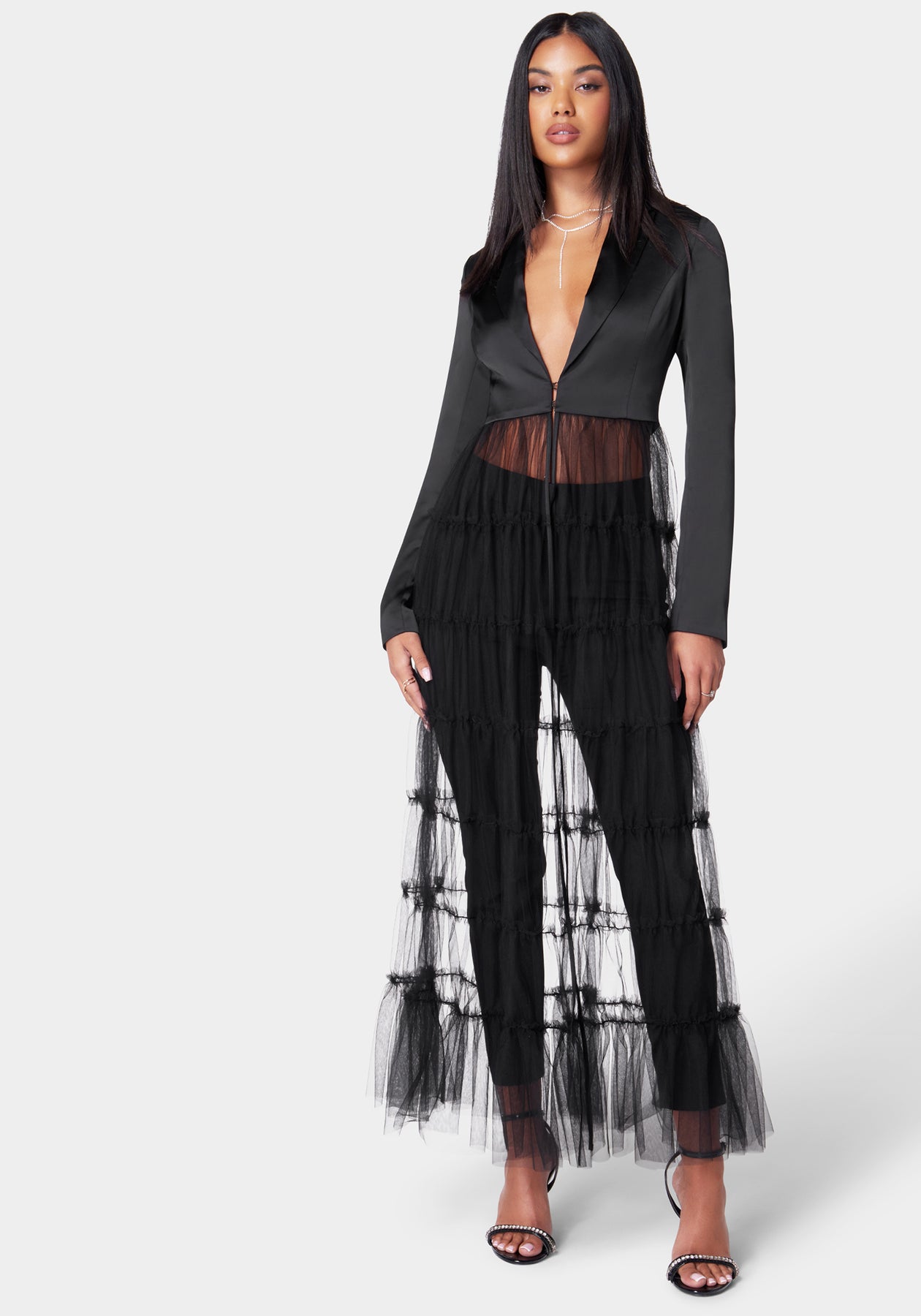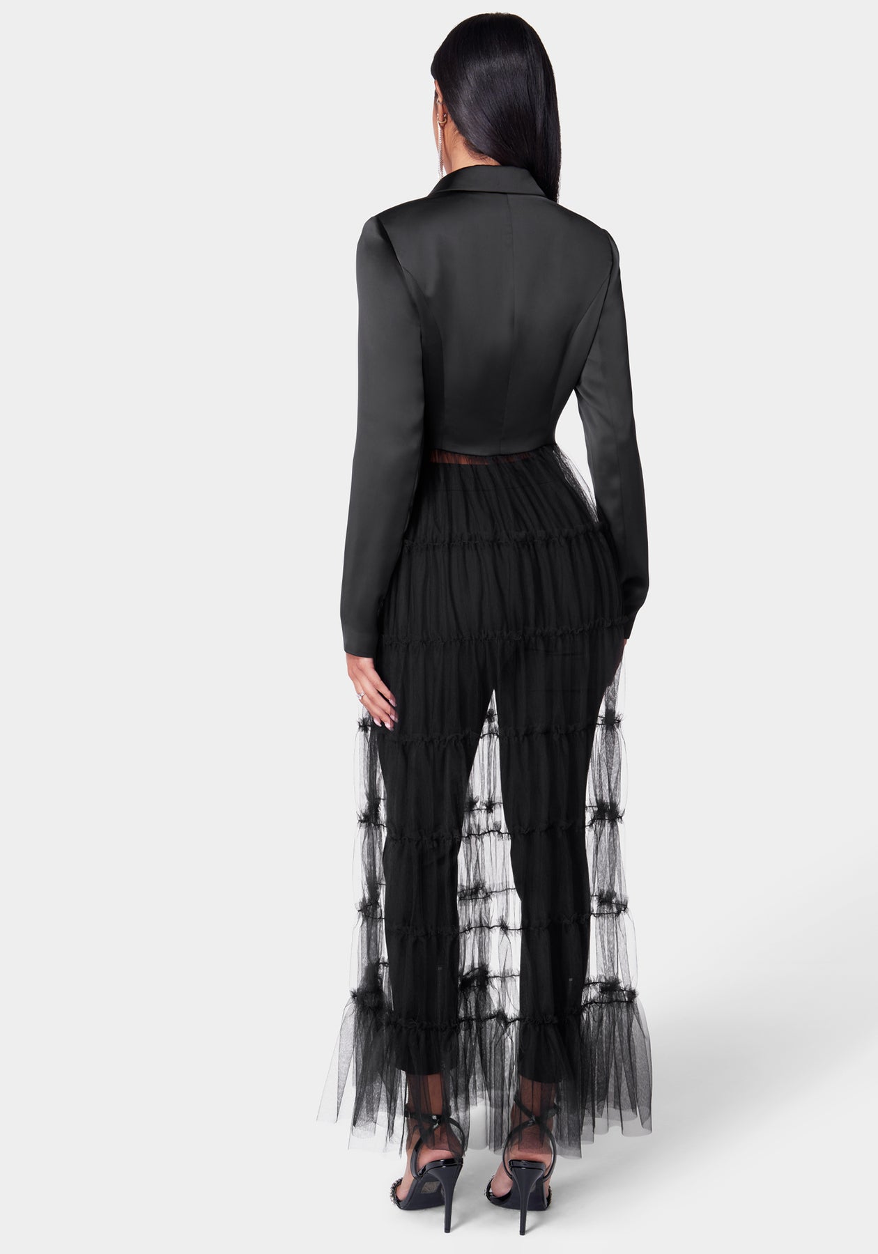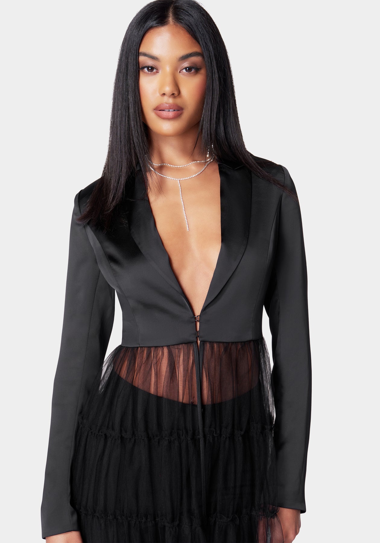 Upgrade your style with this satin tailored jacket featuring an ethereal tulle hem. The clean lines of the tailored jacket contrast perfectly with the airy tulle, creating a captivating look. Ideal for formal and semi-formal occasions.