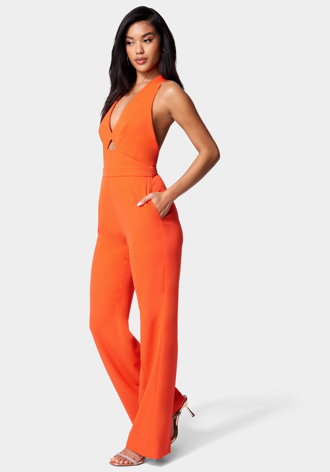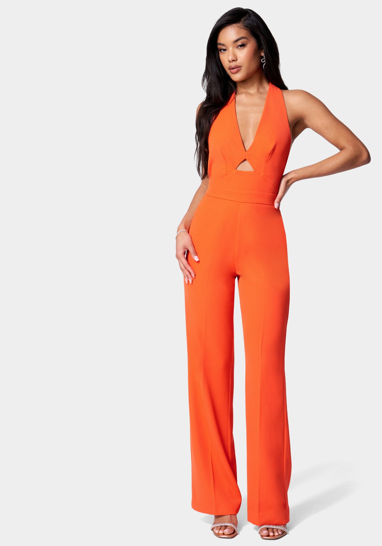 Cut from a sleek satin twill fabric, it features shoulder-baring cutouts and playful halter tie back detail. It also features a center front cutout that adds allure and makes it perfect for any event. A wide leg silhouette completes the look.