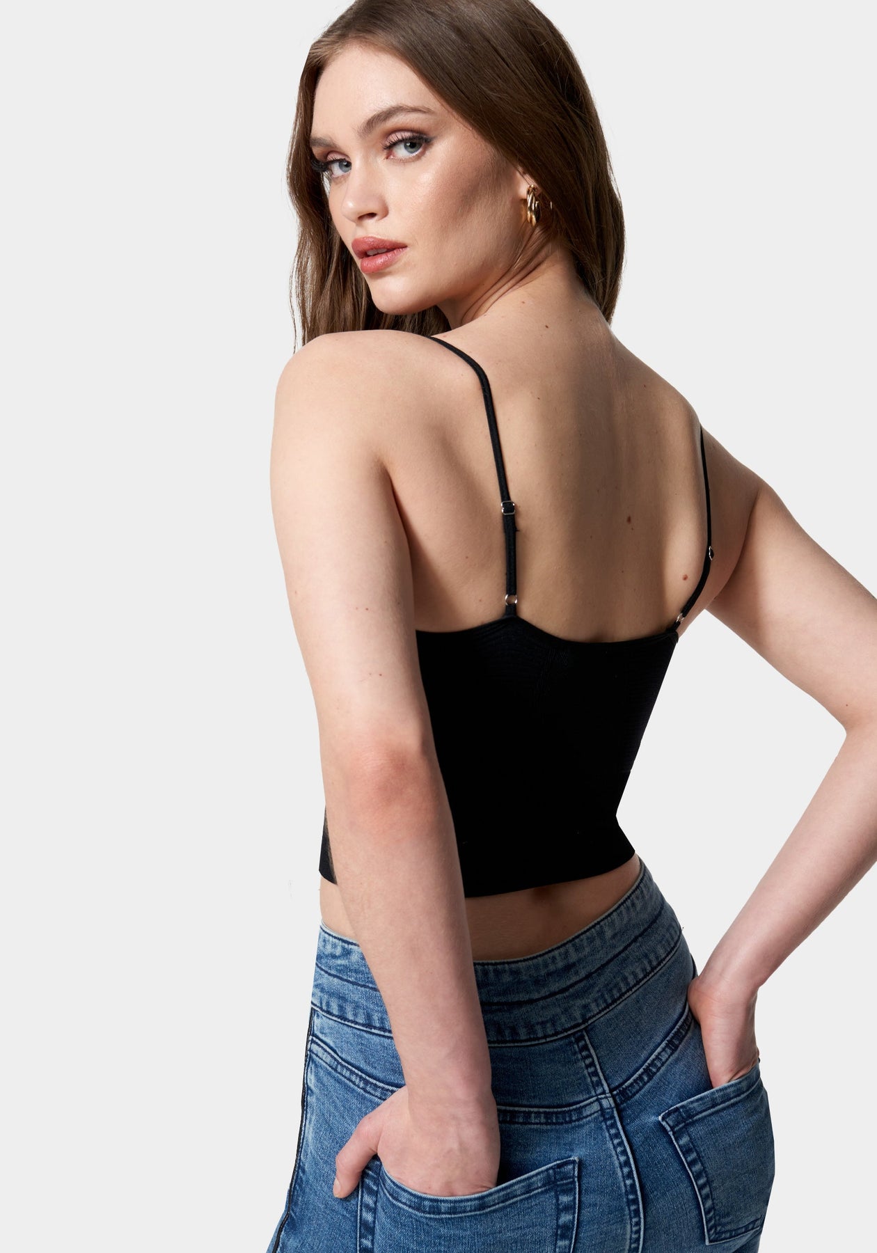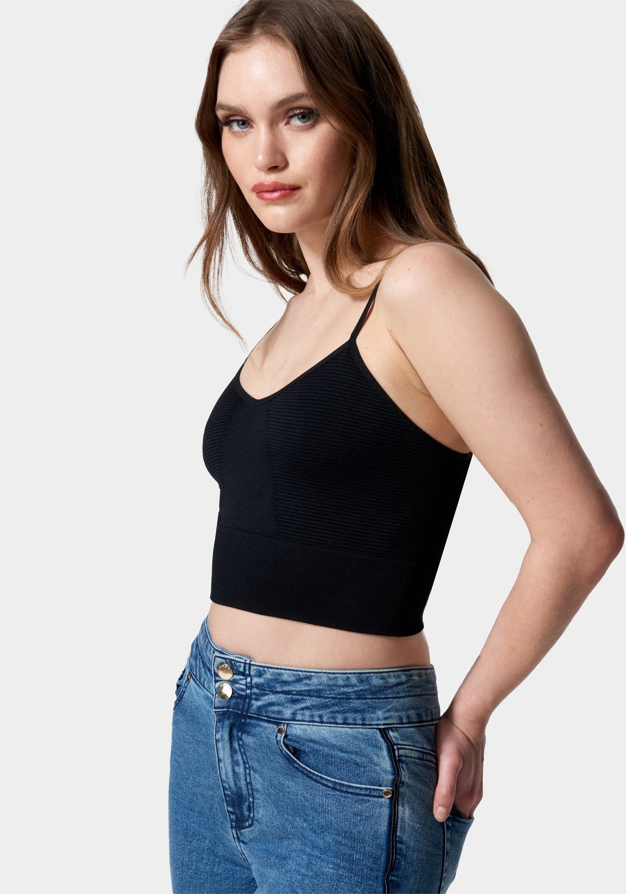 A versatile layering essential, this stretch knit cami features a cropped silhouette and a built-in shelf bra for a smooth look under your outfits.