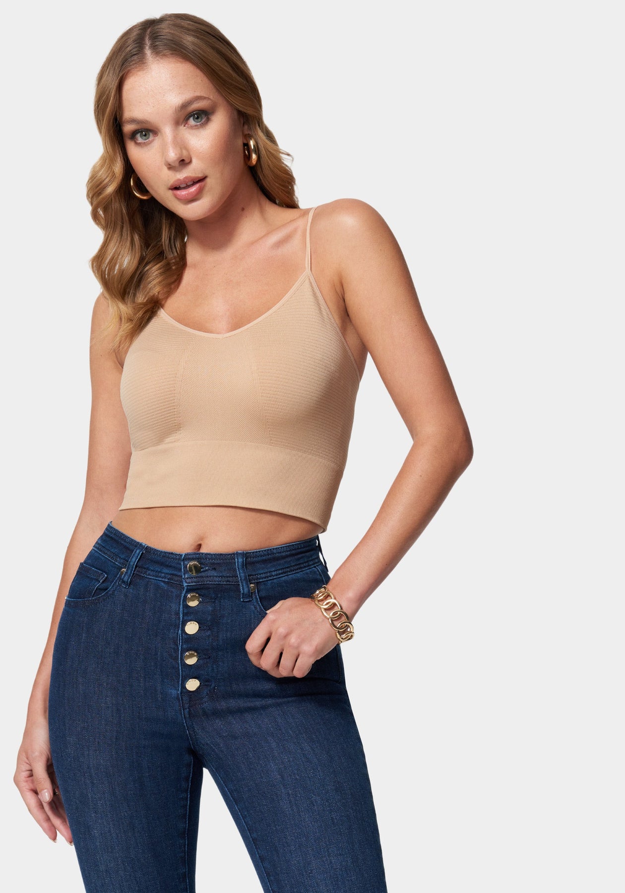 A versatile layering essential, this stretch knit cami features a cropped silhouette and a built-in shelf bra for a smooth look under your outfits.