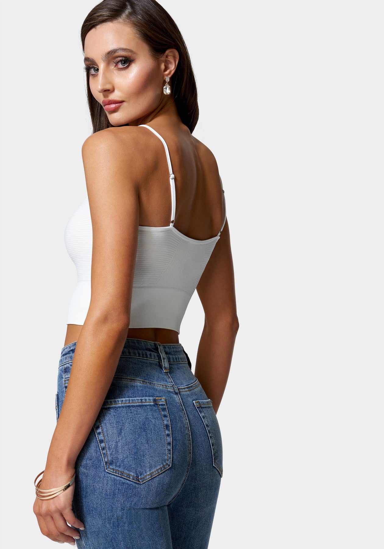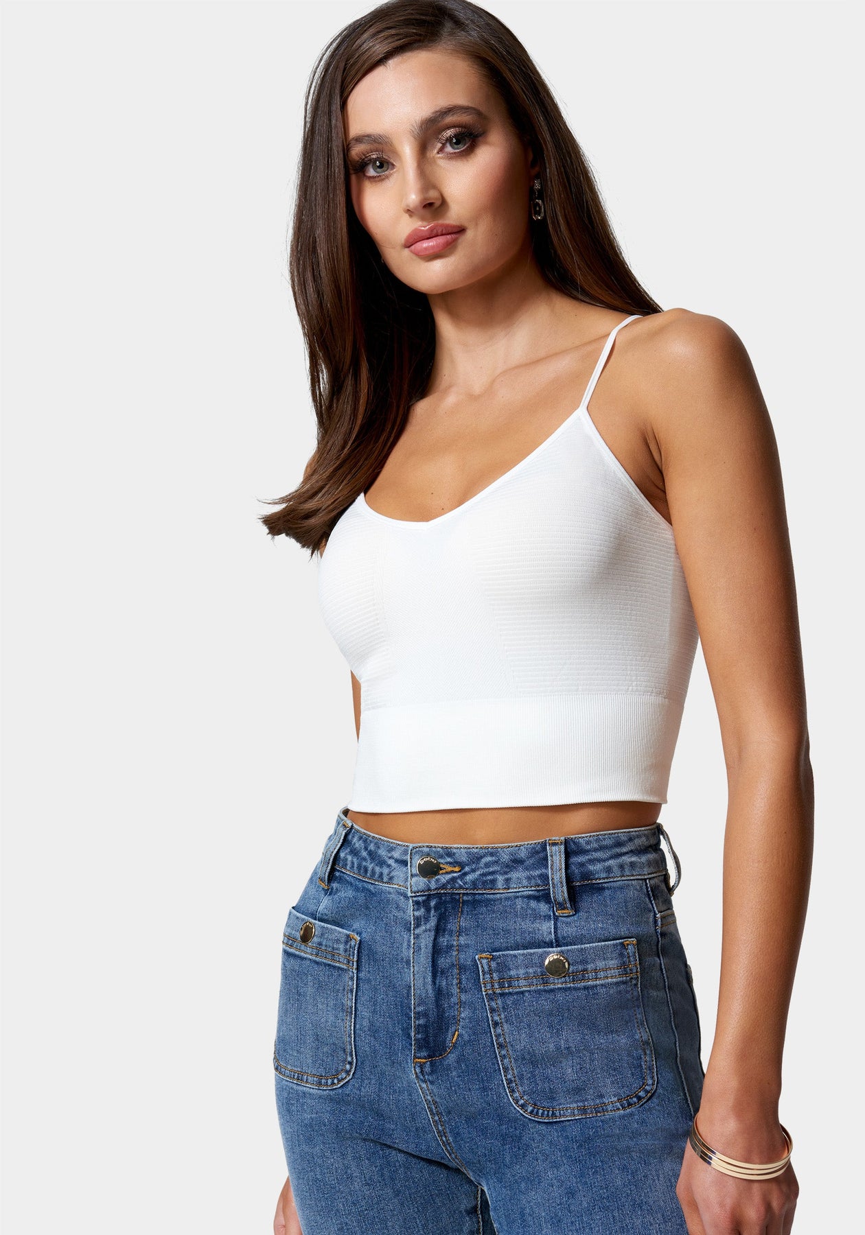 A versatile layering essential, this stretch knit cami features a cropped silhouette and a built-in shelf bra for a smooth look under your outfits.