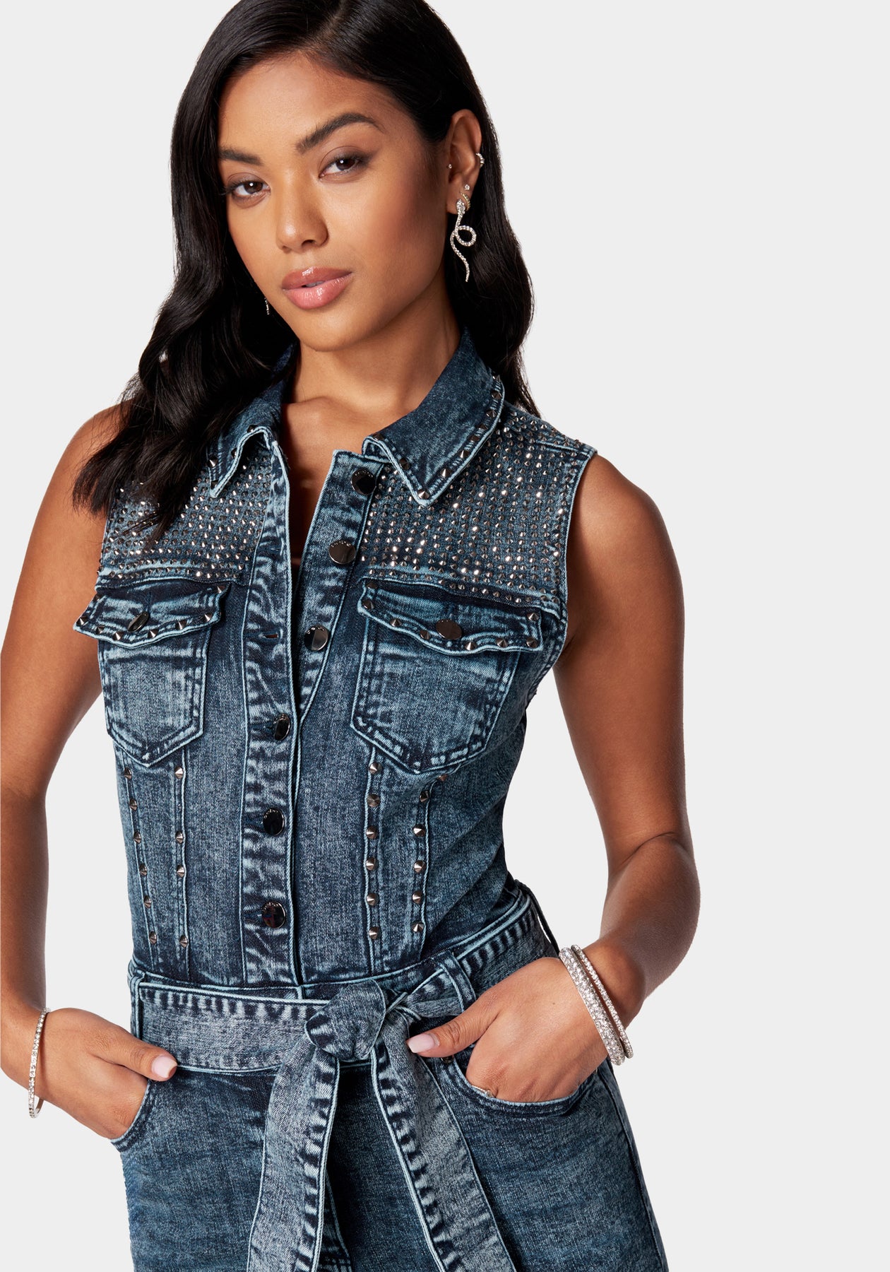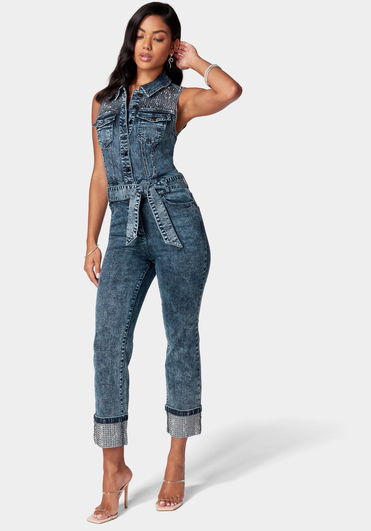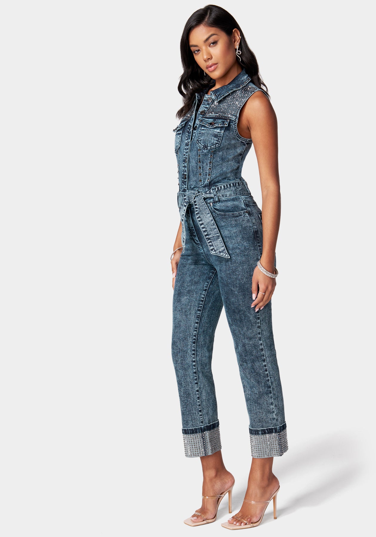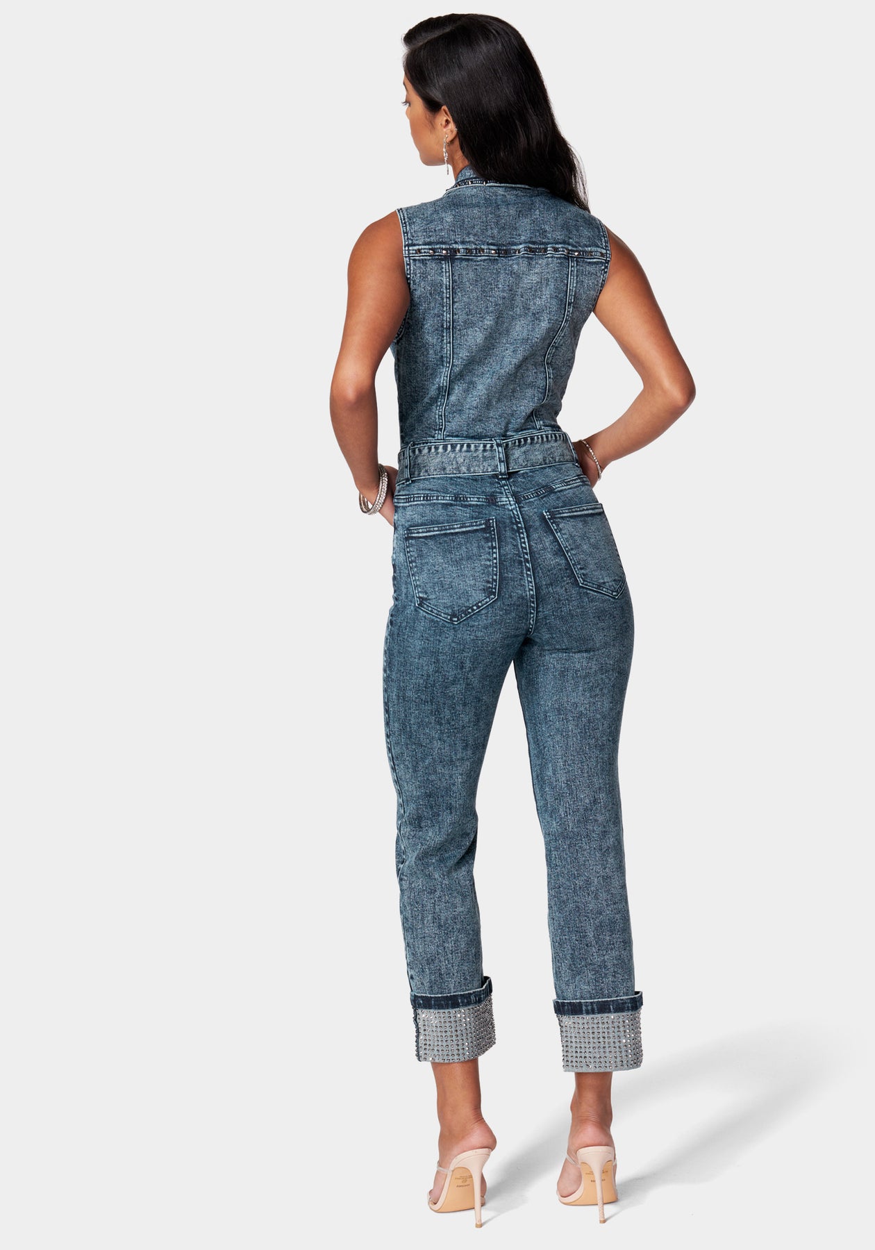 Sequin Sleeveless Cuffed Slim Leg Denim Jumpsuit