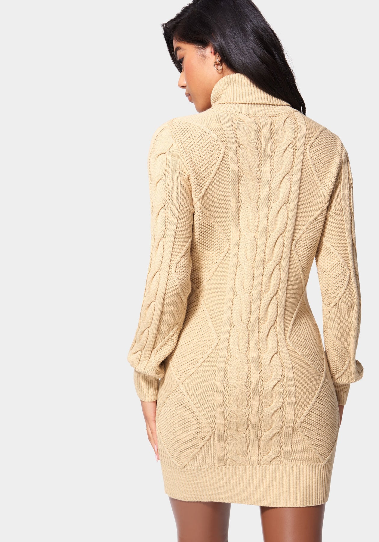 Cozy season. This tunic sweater is the perfect sweater dress combo with its thick cable knit design, turtleneck, studded details.