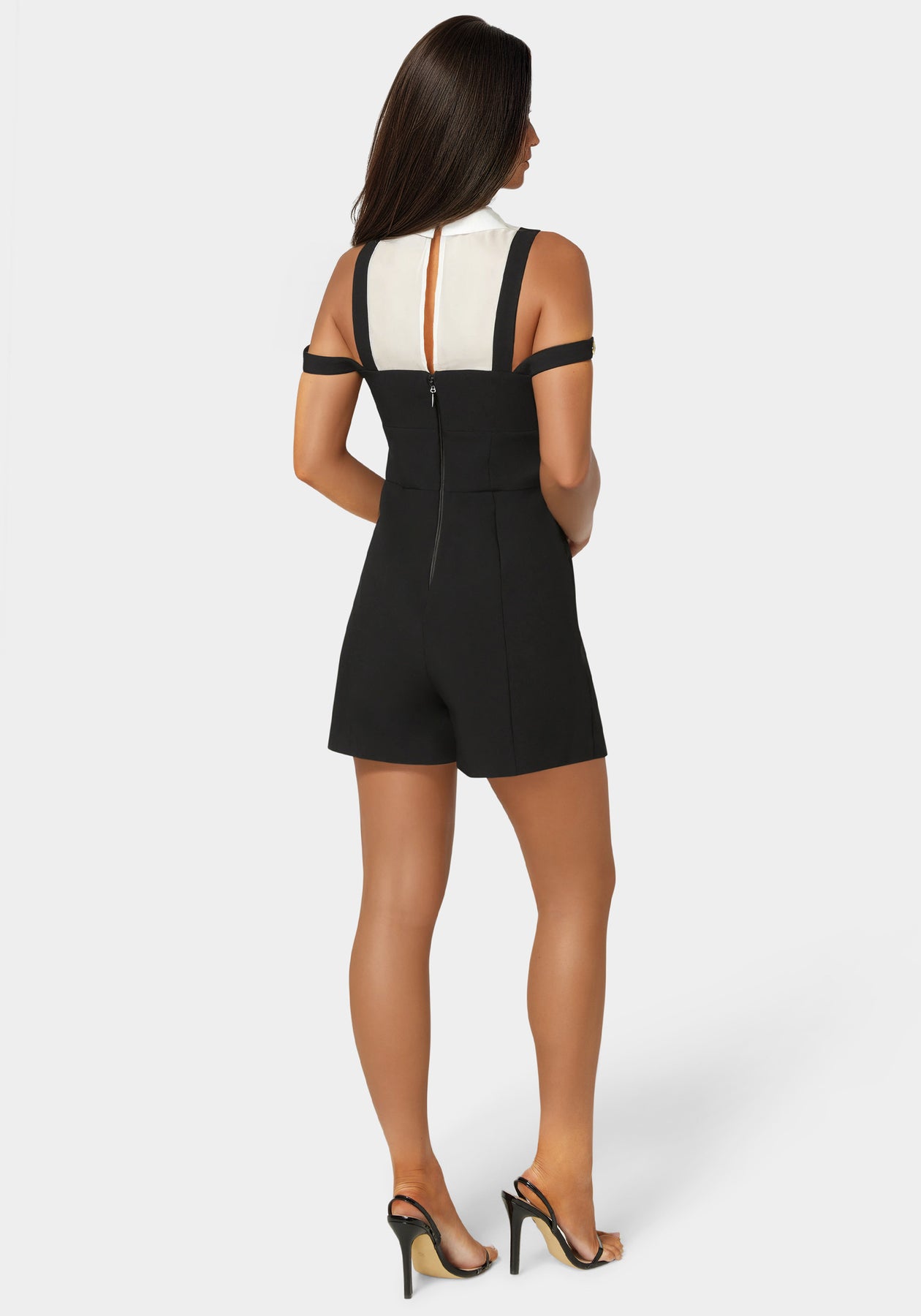 Strike a balance between playful and chic with this fitted romper, adorned with gold decorative buttons and studded details. Its sleek cut and short inseam make it a standout piece for social events or adventurous outings.
