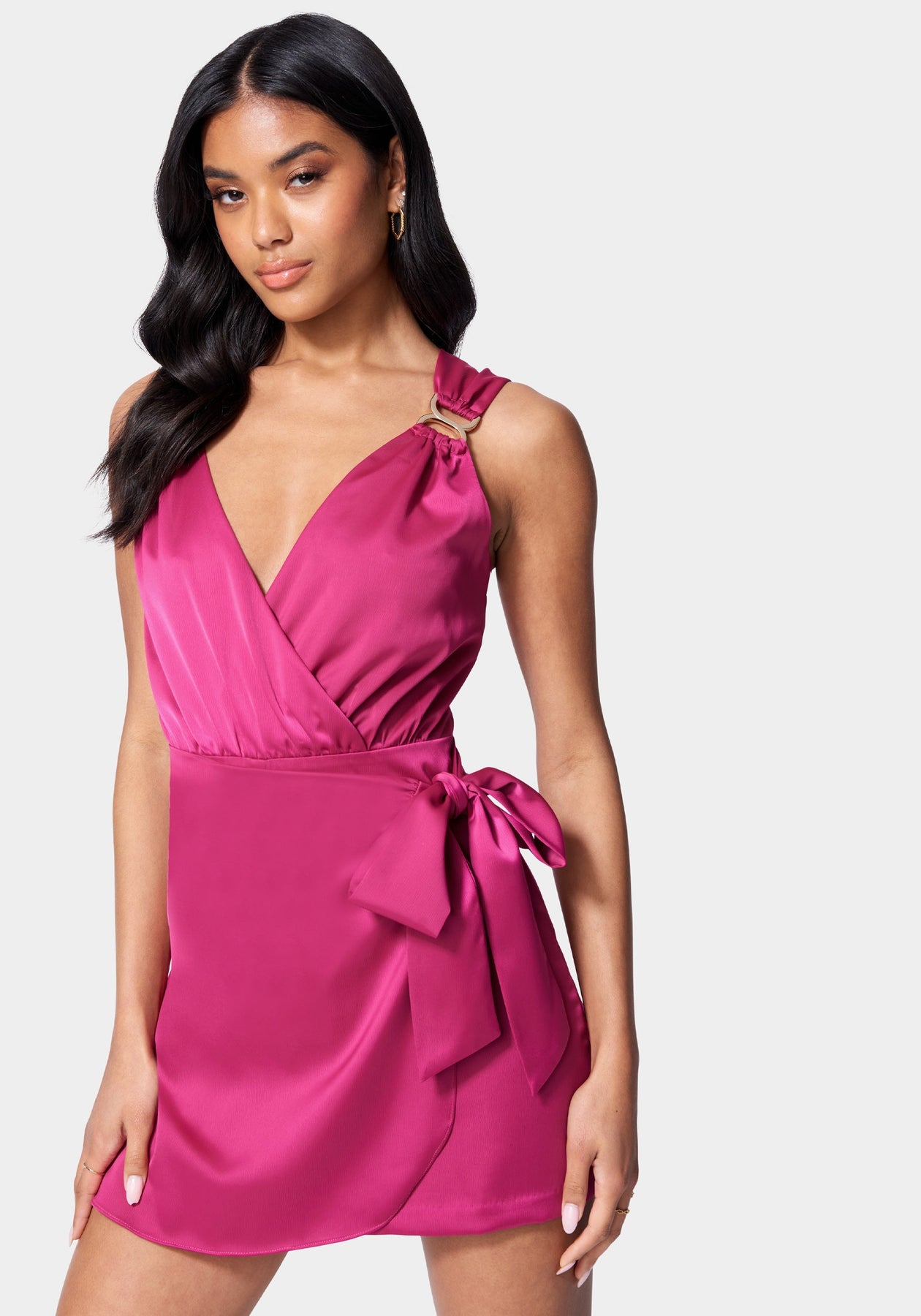 Glam meets edgy in this satin woven romper featuring a self-tie surplice front, polished hardware accents at the shoulders, and a back cutout.