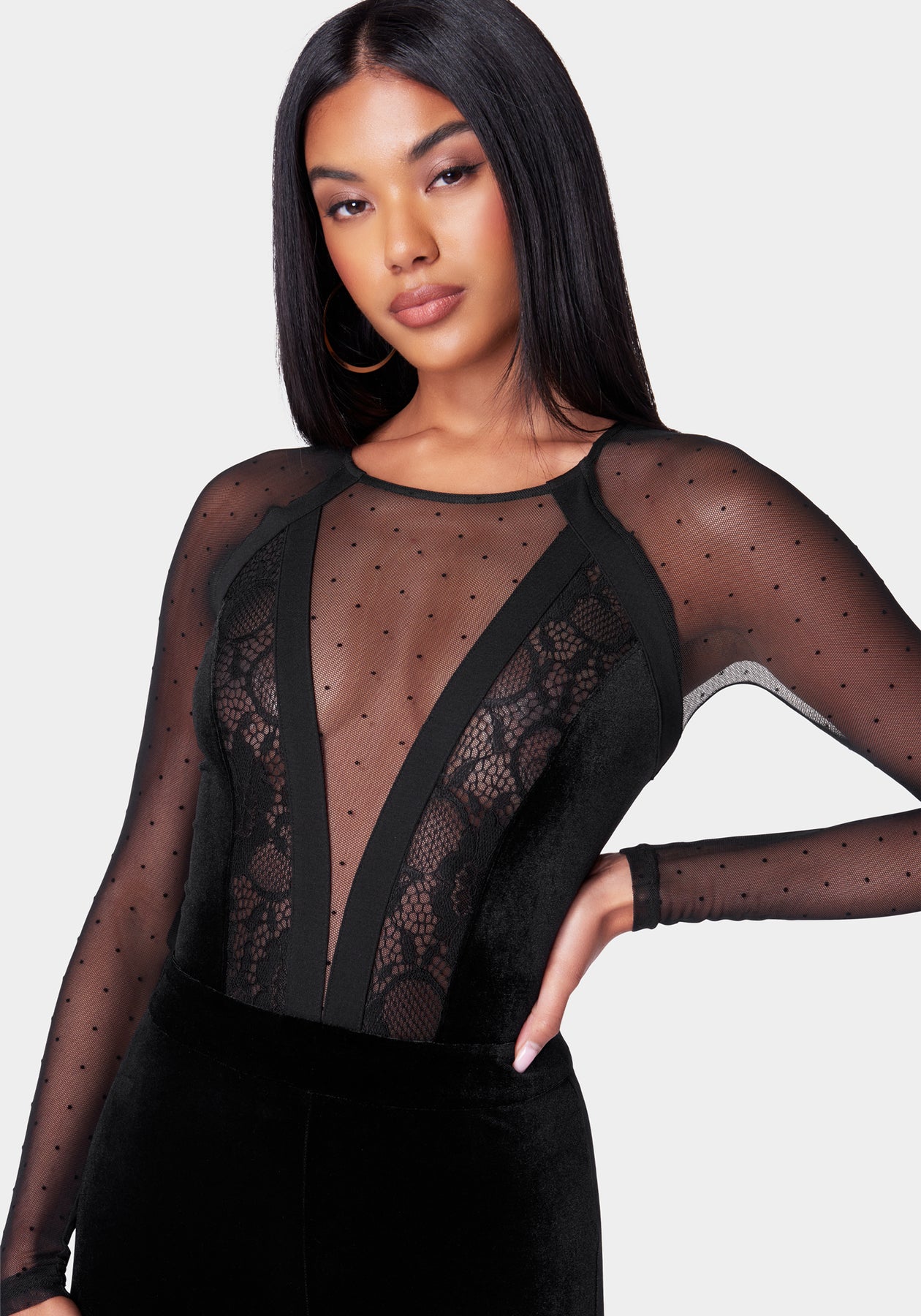 Experience the perfect fusion of comfort and class with this swiss dot combo velour catsuit. The plush velour material provides a luxurious feel, while the delicate swiss dot detailing adds a touch of refined elegance.