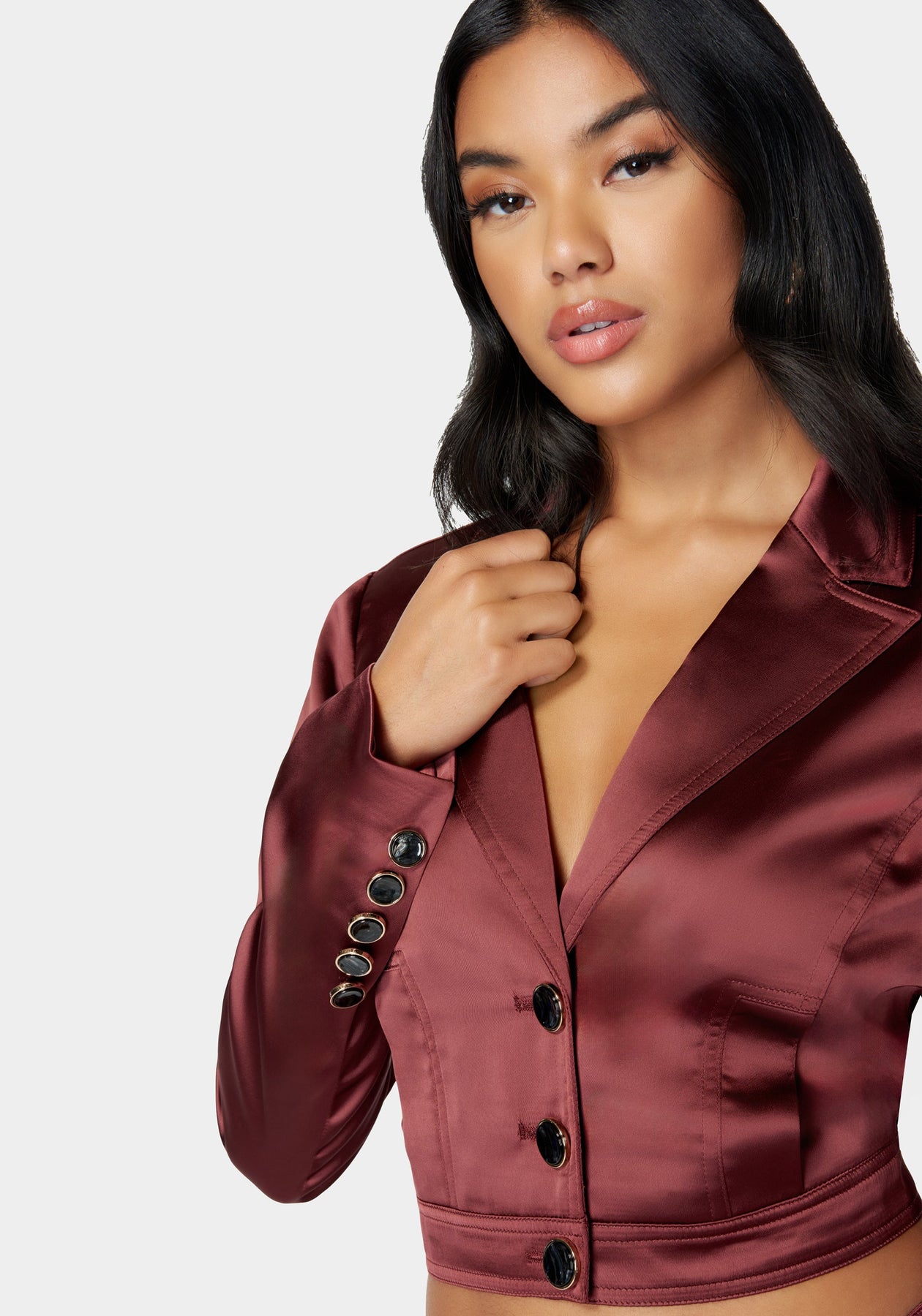 Elevate your wardrobe with our stylishly cropped Tailored Satin Jacket. Crafted with sleek lines for a polished silhouette, it adds a touch of sophisticated class to both your evening and daytime professional looks.