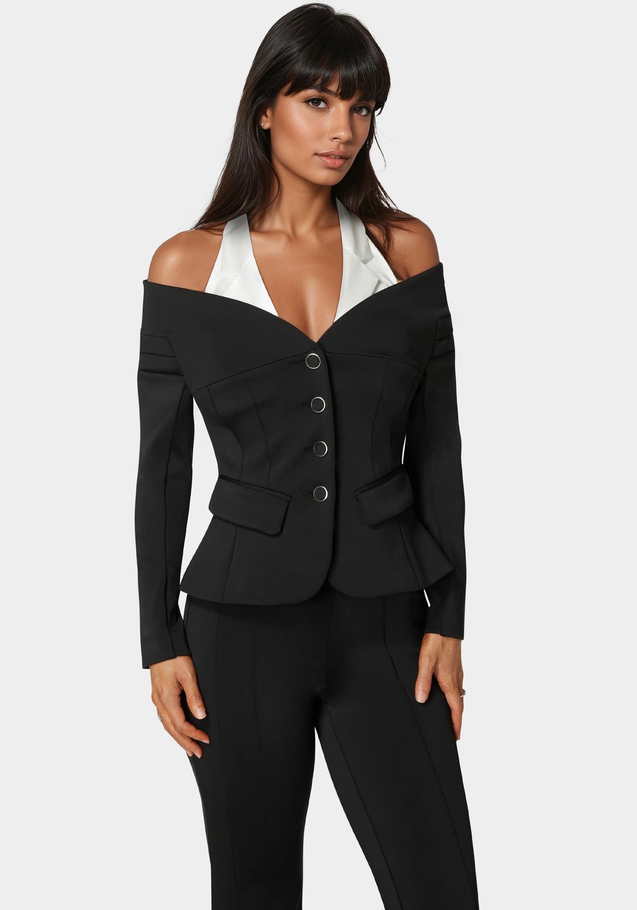 Fitted off-shoulder blazer with stretch fabric and button closure, perfect for evening events or formal office attire.