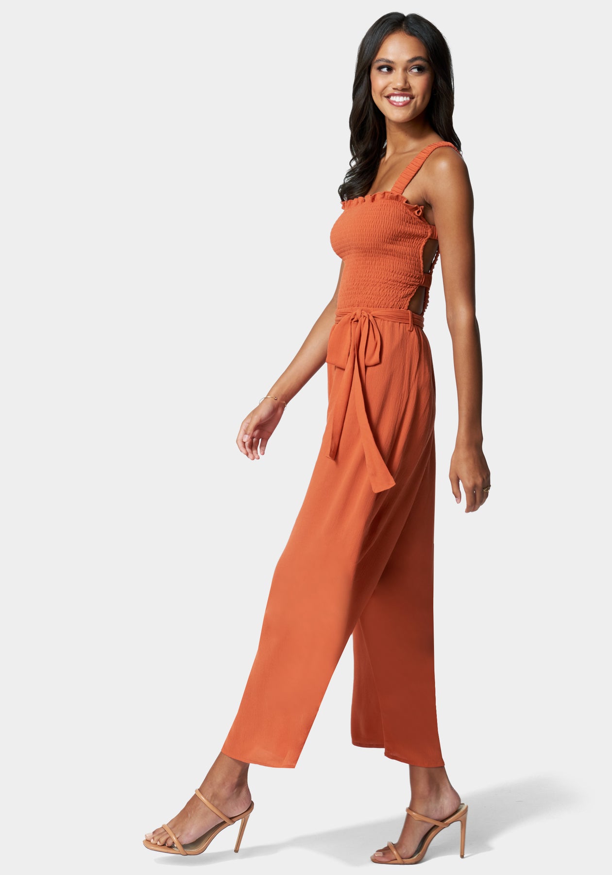 The Caged Back Culotte Jumpsuit is perfect for your casual summer occasions. Featuring a self tie waist, smocked bust line and caged back detail that shows off your back Dress it up with heels or sandals for a stylish look!