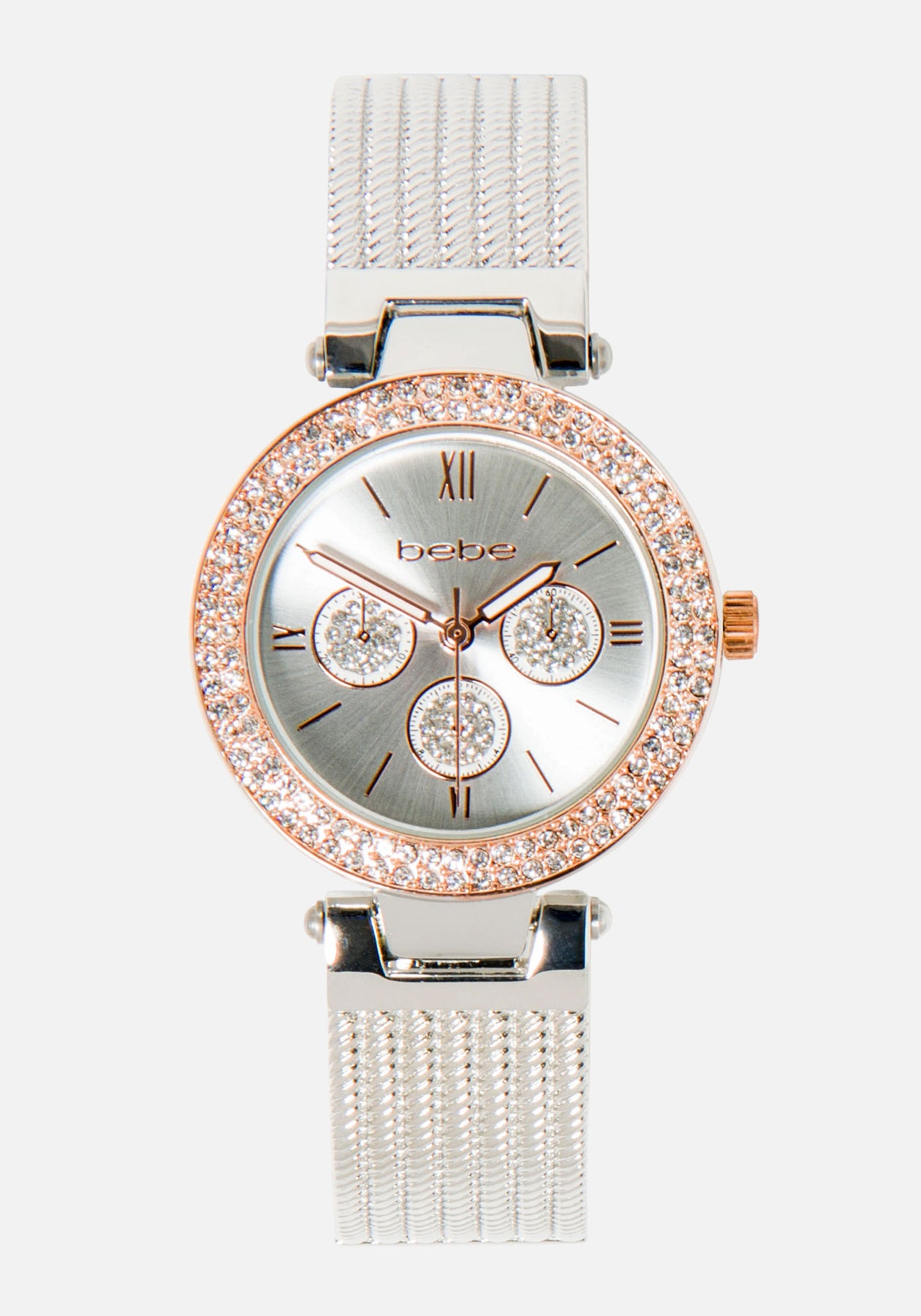Dazzling and functional, the Bebe Gem Wrist Watch is sure to make a fashion statement with the classic Bebe logo on the face, roman numerals for timekeeping, and crystal embellishments.
