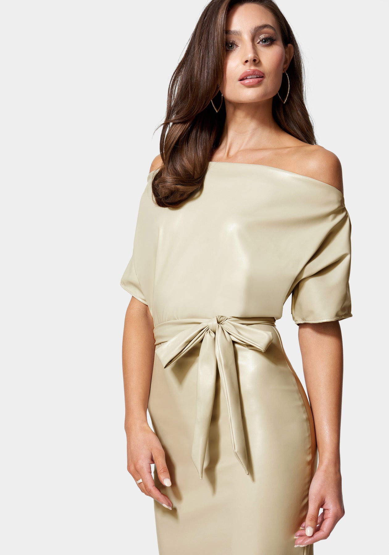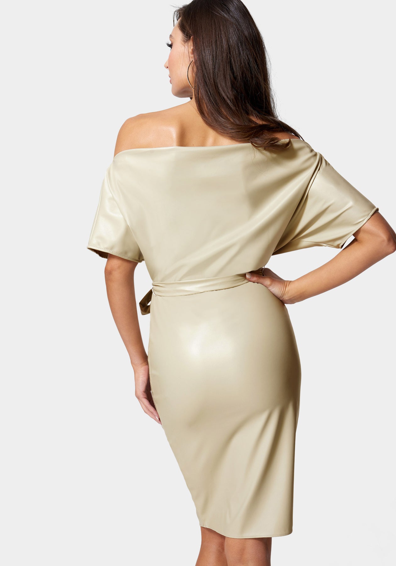 Meet your match. Made in a buttery-smooth vegan leather, this pencil dress features sleek dolman sleeves and a waist-defining belt for that coveted hourglass figure.