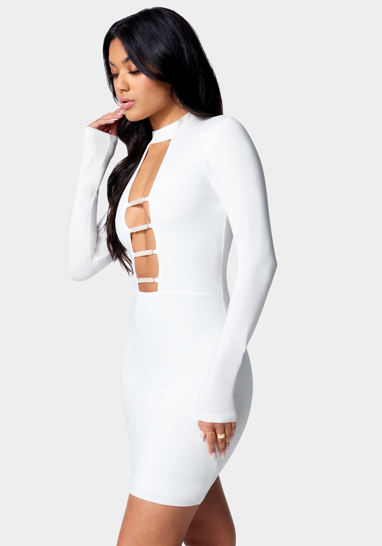 This curve-hugging long sleeve Embellished Caged Dress features a tastefully provocative open front for a look no one will be able to forget.