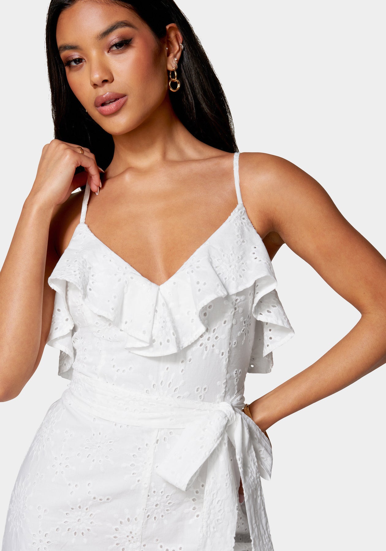 Add a touch of romance to your outfit with this eyelet ruffle romper. The ruffled neckline adds a flirty touch to this white romper for weddings and garden parties.