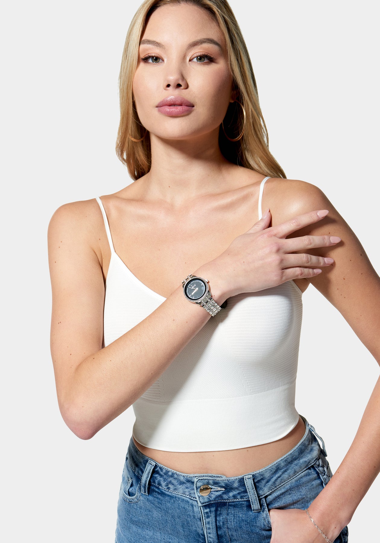 Featuring a glossy black dial and crystal bezel, this luxurious silver link watch is an excellent addition to your collection.