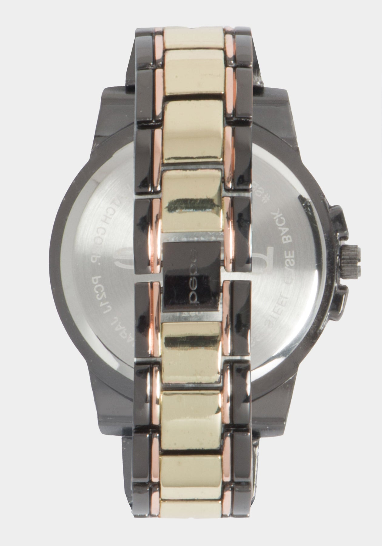 Featuring gunmetal, gold, and silver-toned details, this bold timepiece flaunts a crystal bezel and versatile style.