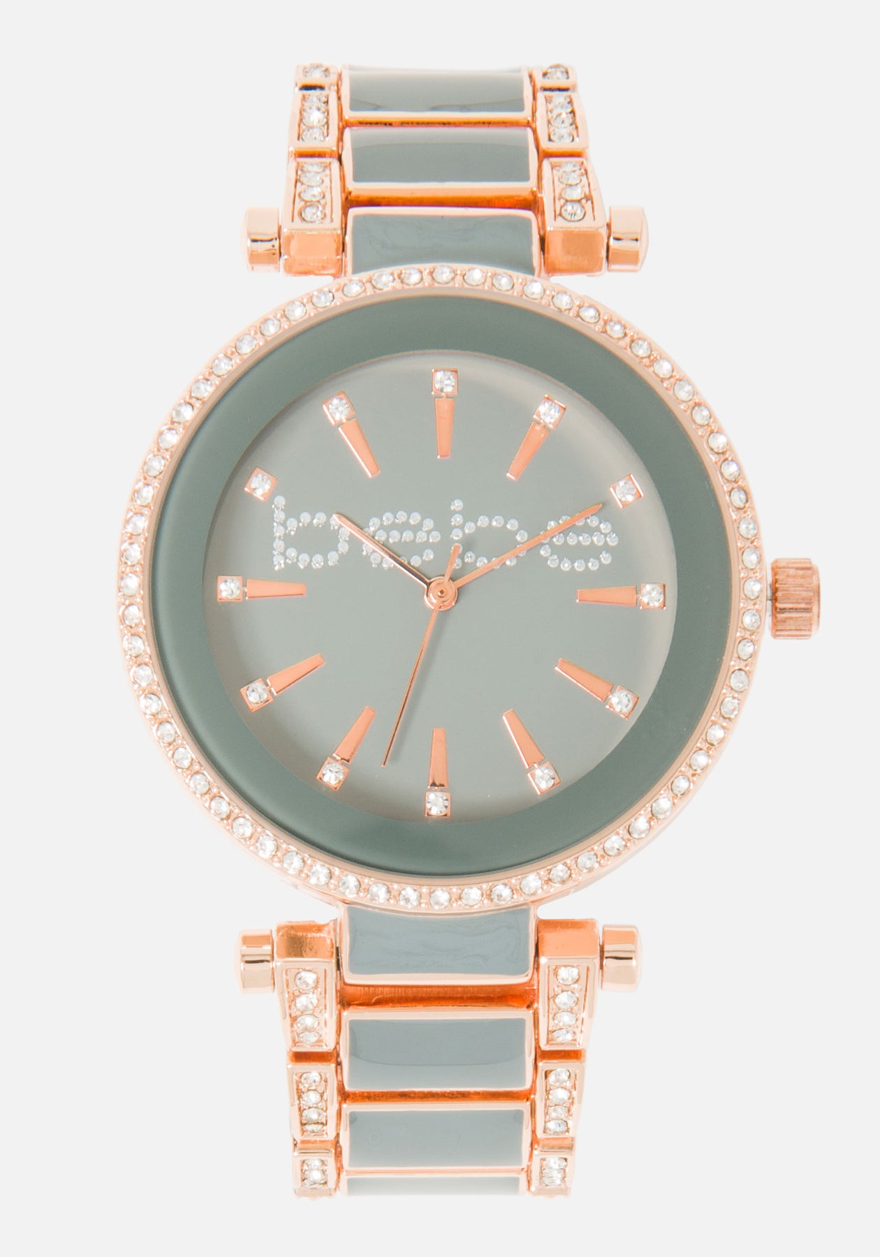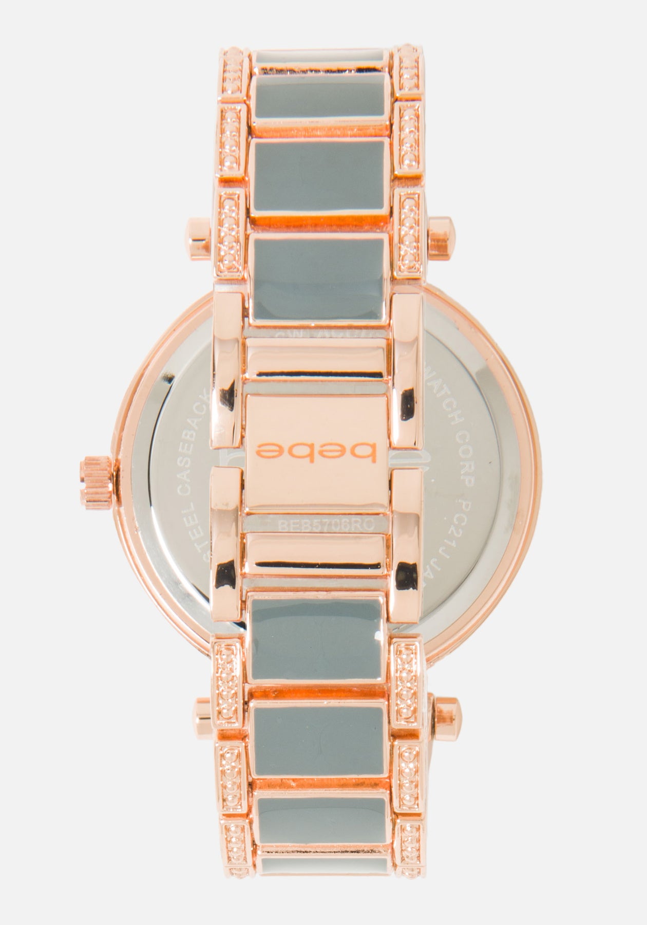 Fashion, function, value, grey, and rose gold enamel case and bracelet with Iconic crystal BEBE Logo Dial.