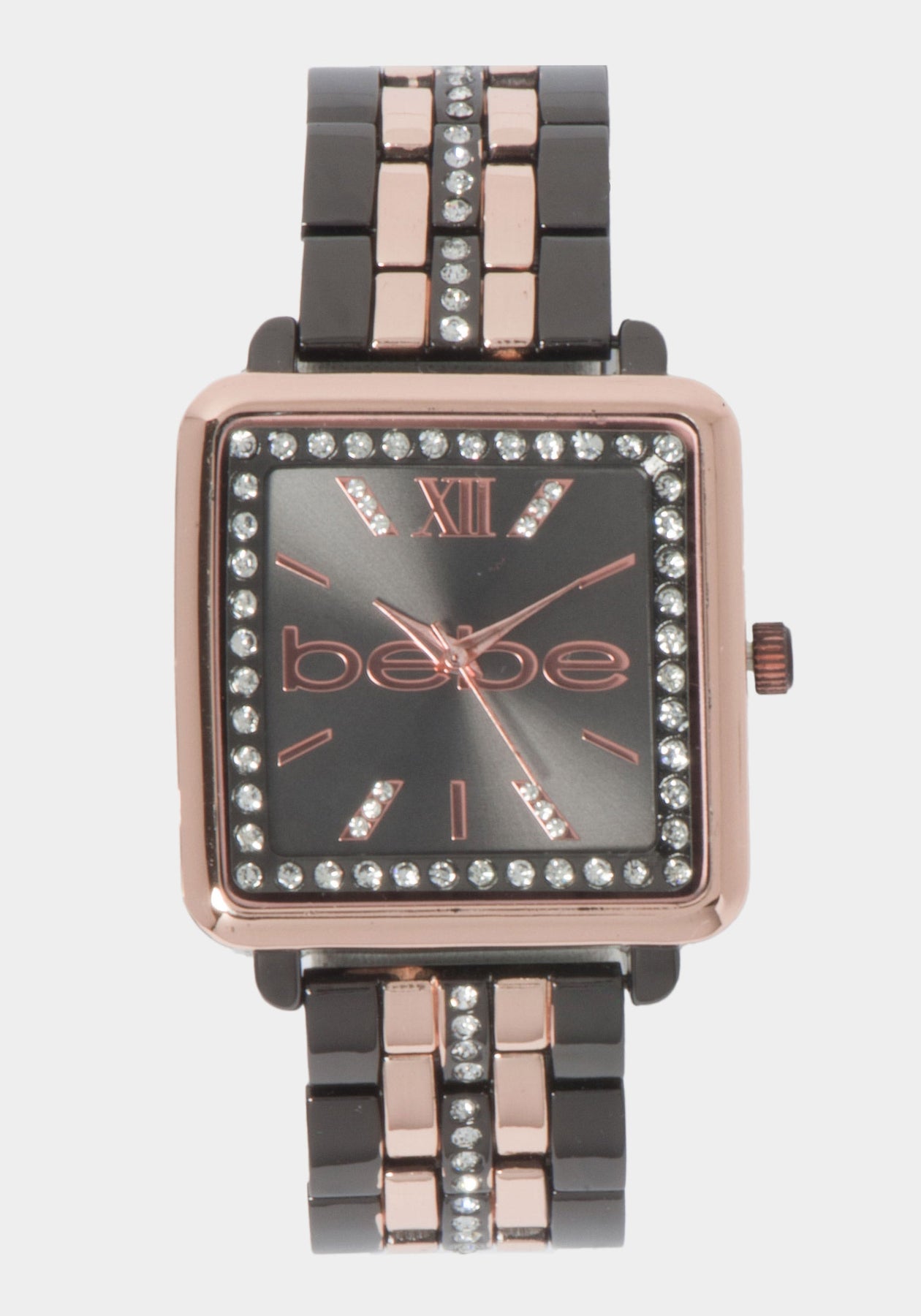 A bold two-tone watch catches the eye with sparkling crystal details and a square case.