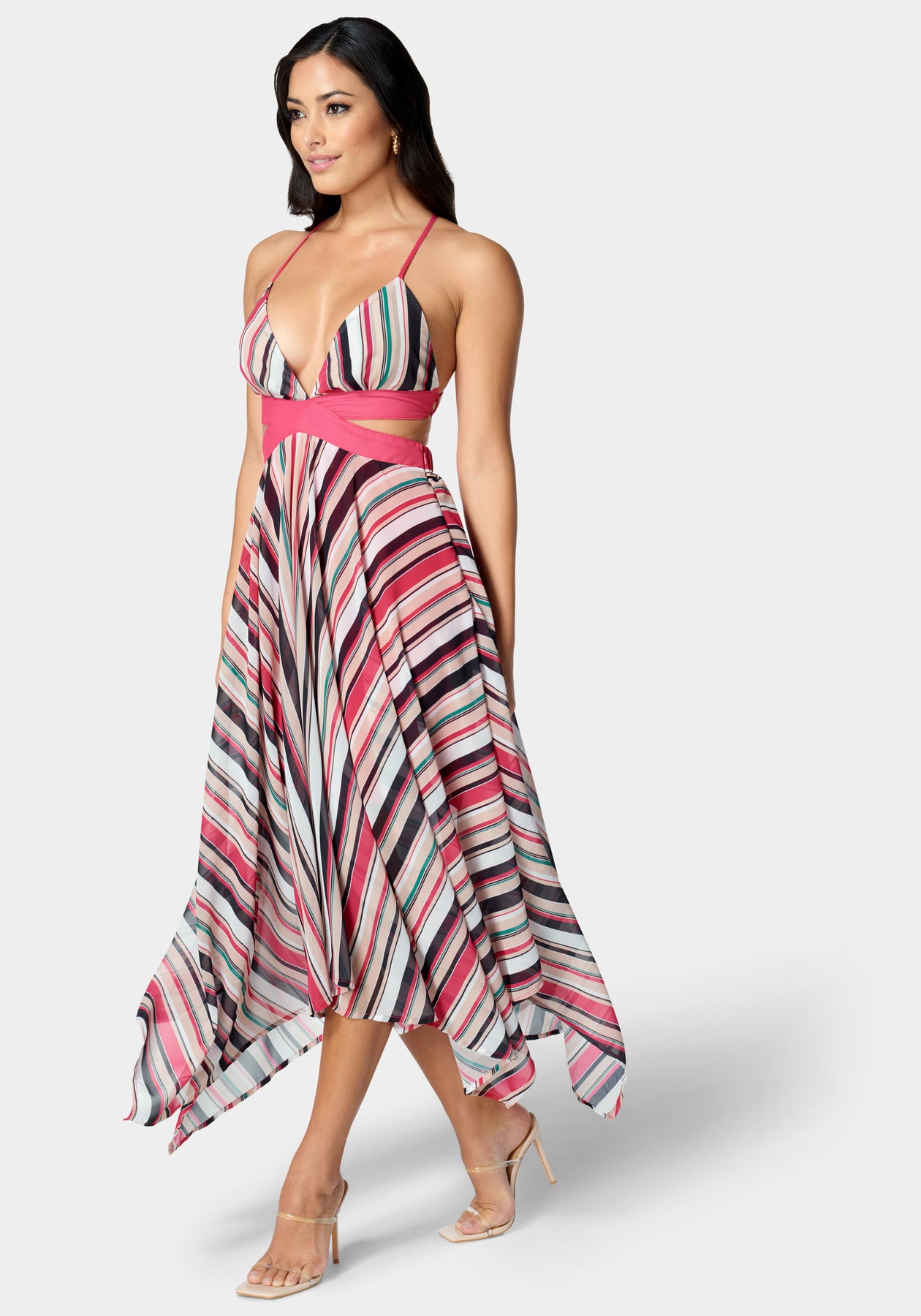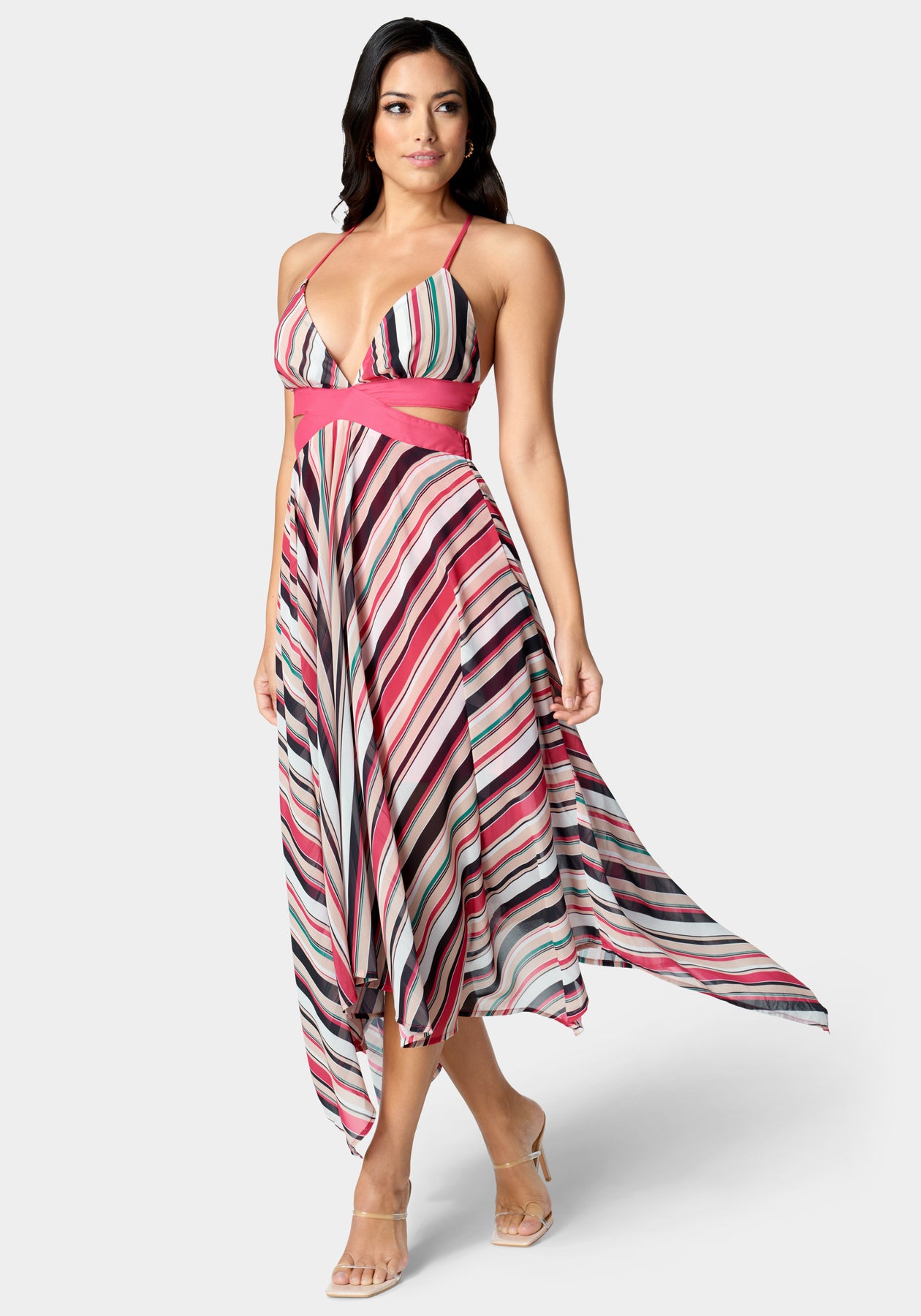 This maxi’s stripes add instant interest and sophistication to your look. A handkerchief hemline, strappy back, and cutouts make this bold statement piece easy to dress up or down with sandals or heels.