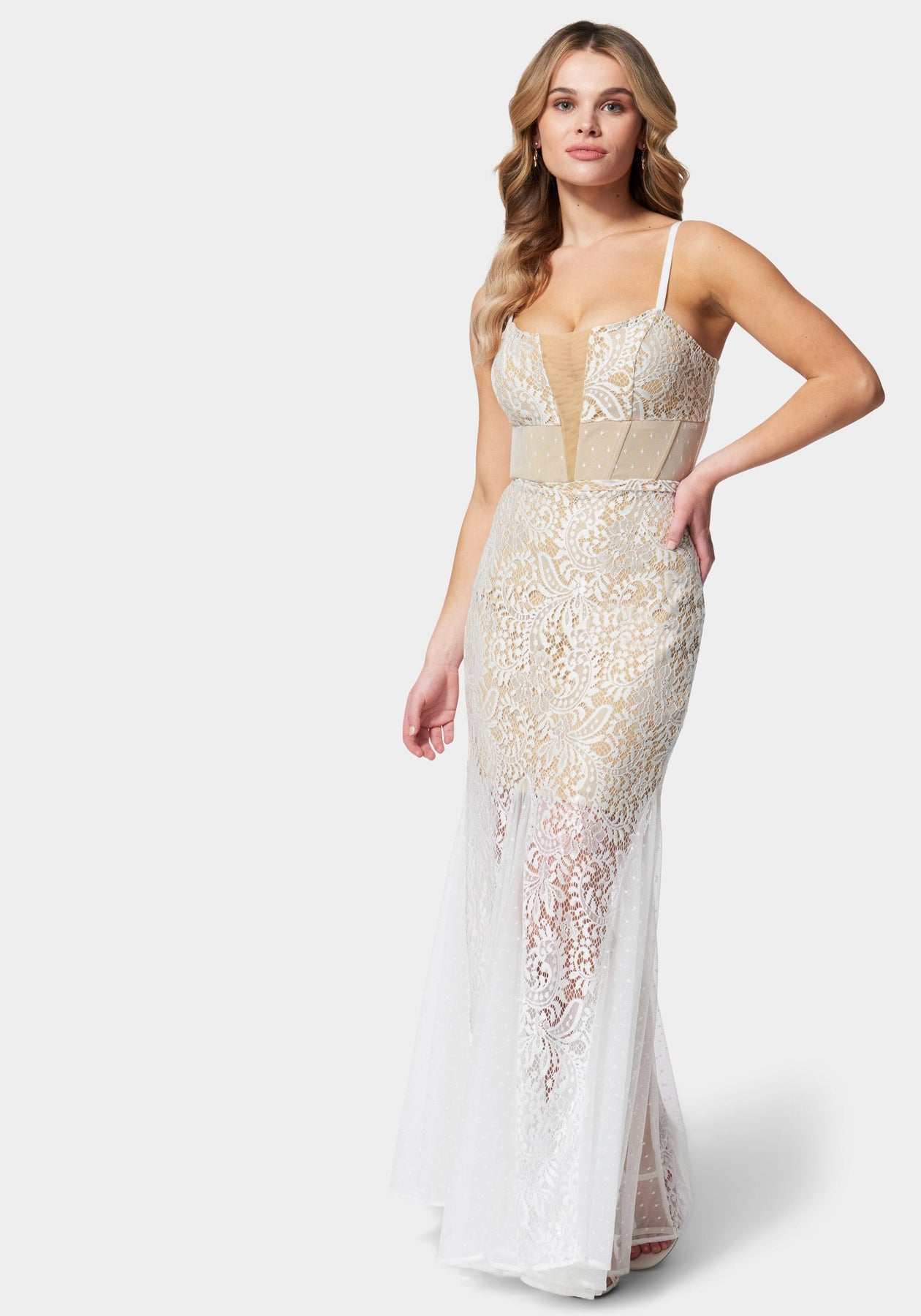 Ready for RSVP season, this floor length gown features an delicate lace corset bodice that accentuates the curves, and a mermaid-style skirt. Finished with a back zipper.
