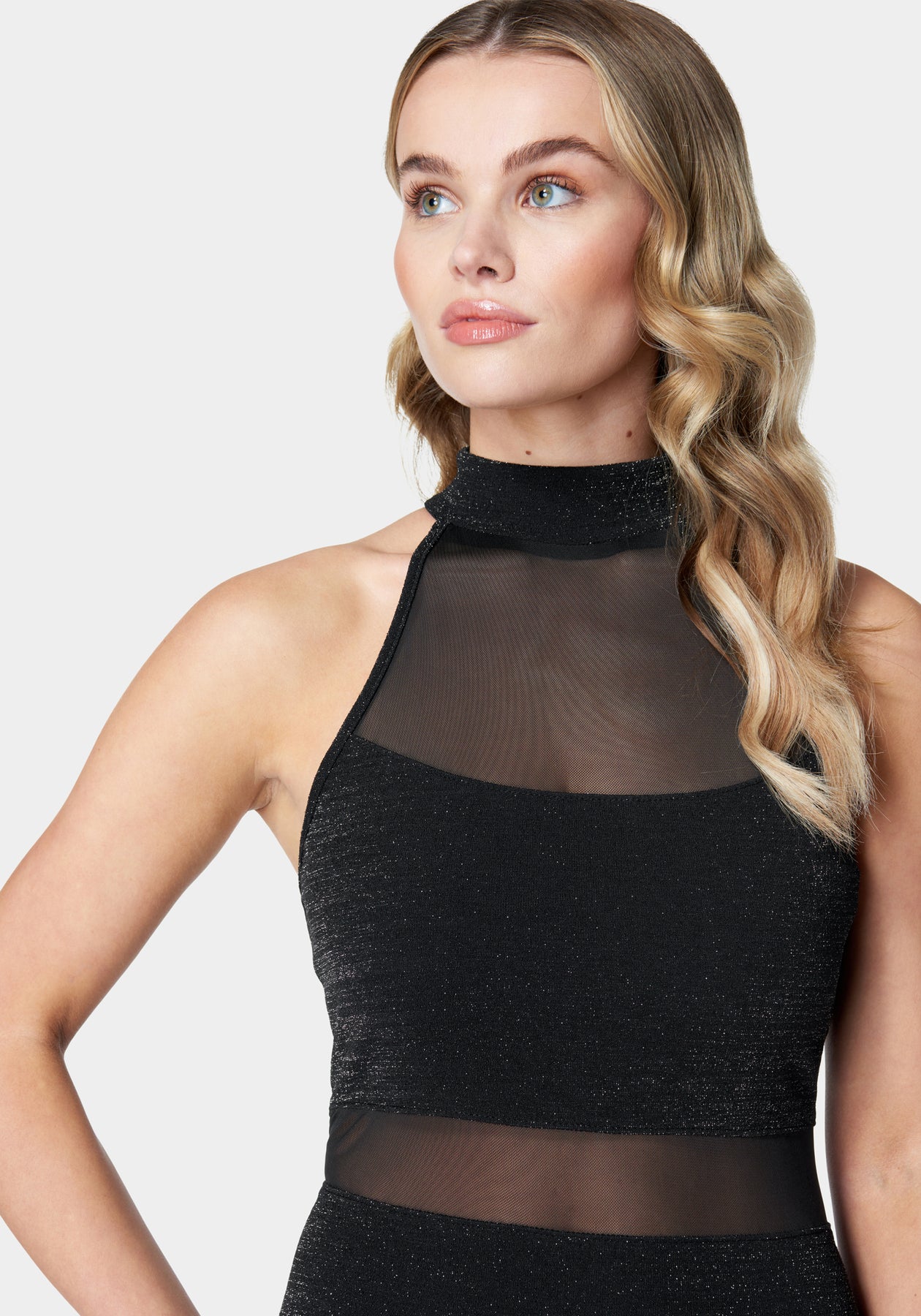 Be classic with this mesh and metallic scuba dress. Featuring a mesh neckline, bodice and body hugging fit.