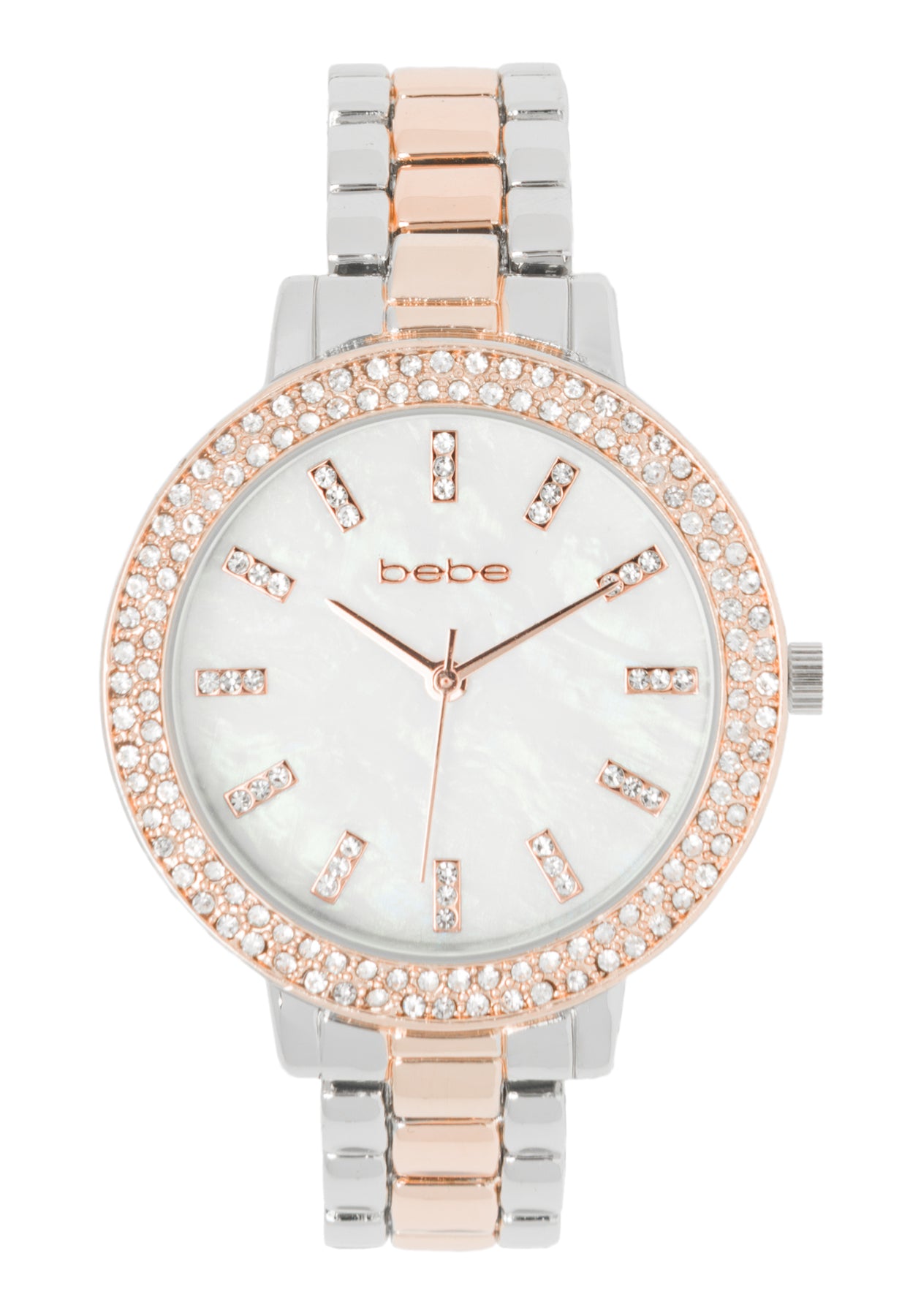 Glam enough for evening but great for work too, this mixed-metal watch features a shimmery crystal-embedded bezel and hour markers. A pearlized dial makes it feminine. Includes 3-hand styling and a discreet bebe logo.