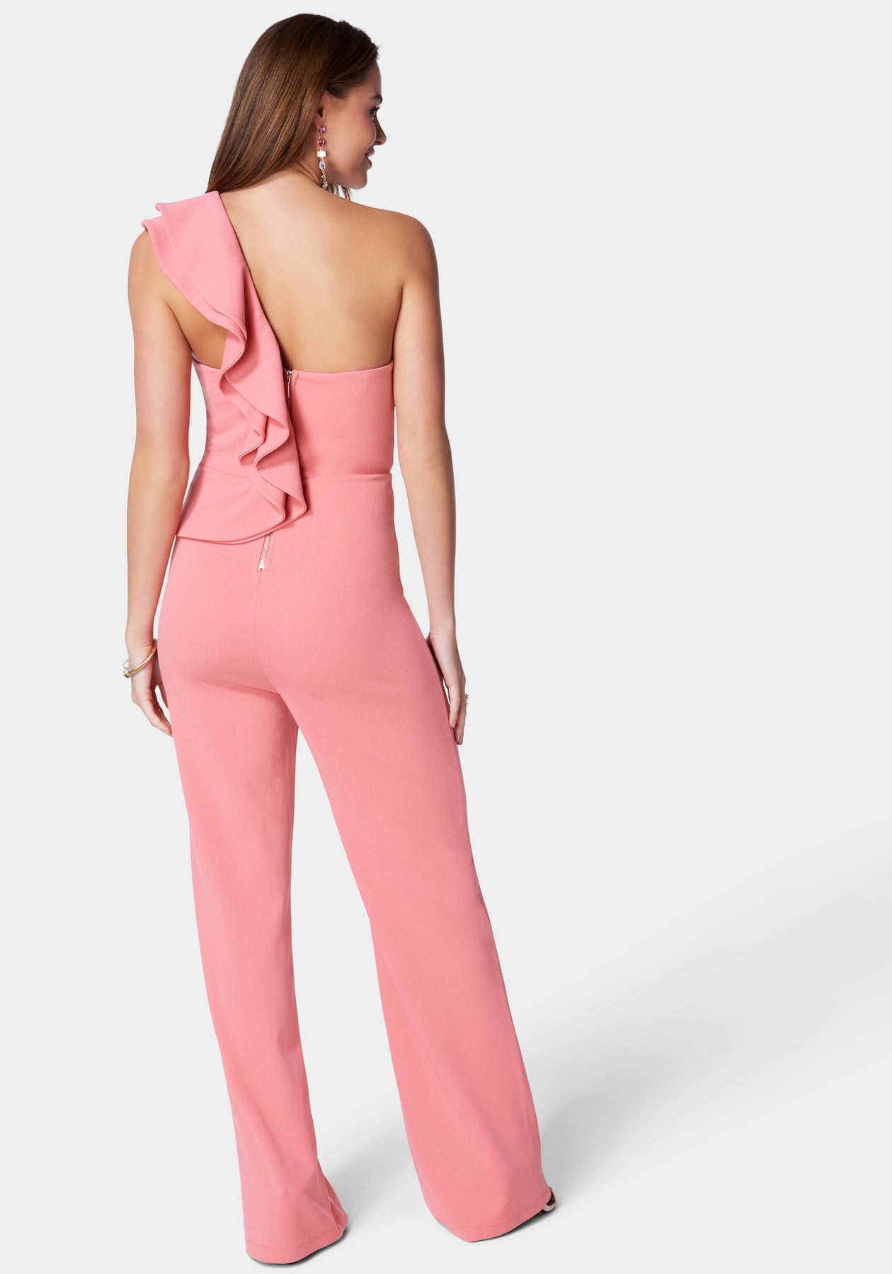 The one shoulder ruffle crepe jumpsuit adds a dash of drama to your wardrobe with its asymmetrical design. A playful ruffle cascades from the single shoulder, creating an eye-catching silhouette. Crafted in crepe, this jumpsuit has a sophisticated texture that's perfect for any occasion.