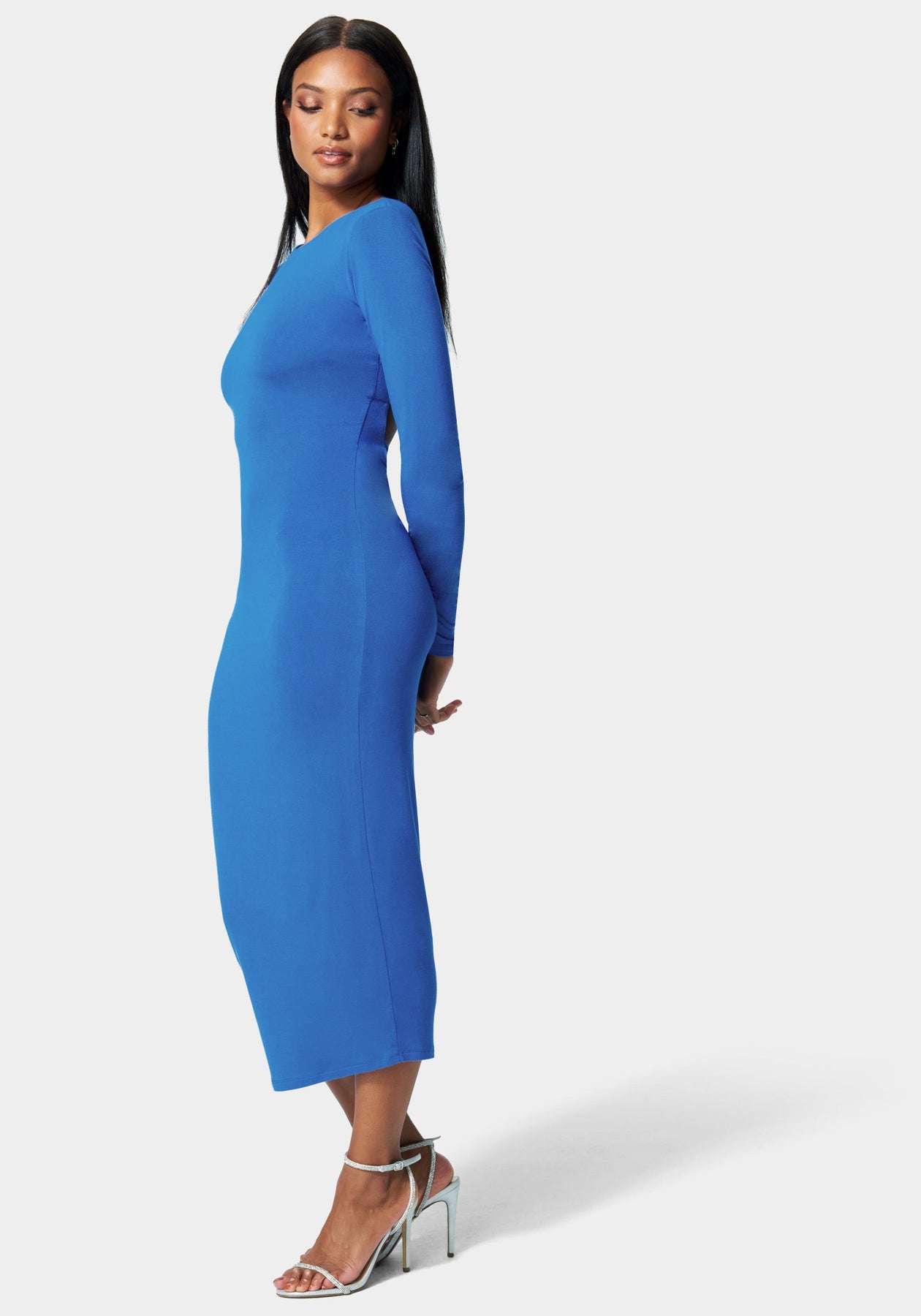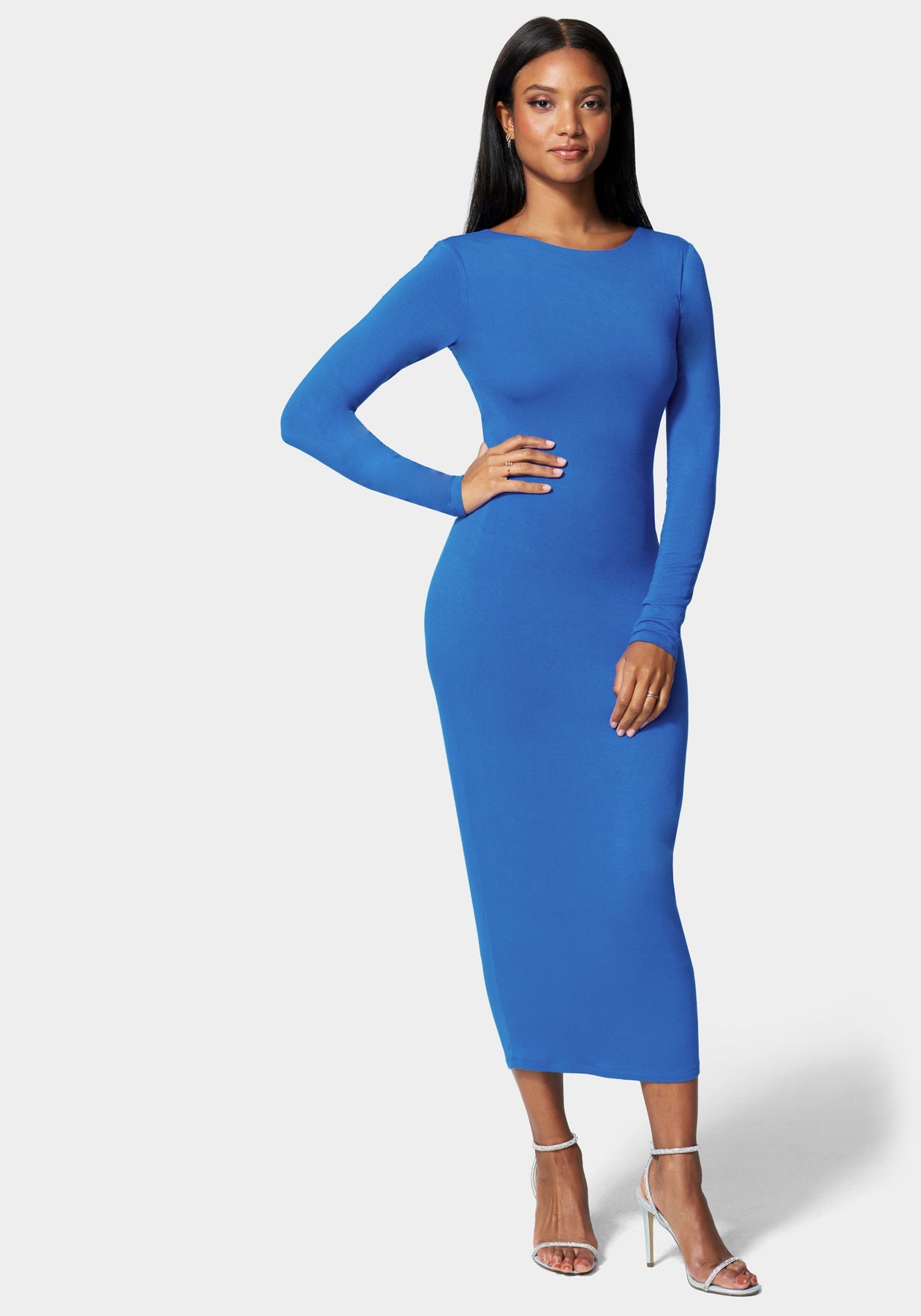 Long and sleek design, with a sexy open back. This ankle dress features long sleeves and pairs perfectly with some strappy heels.