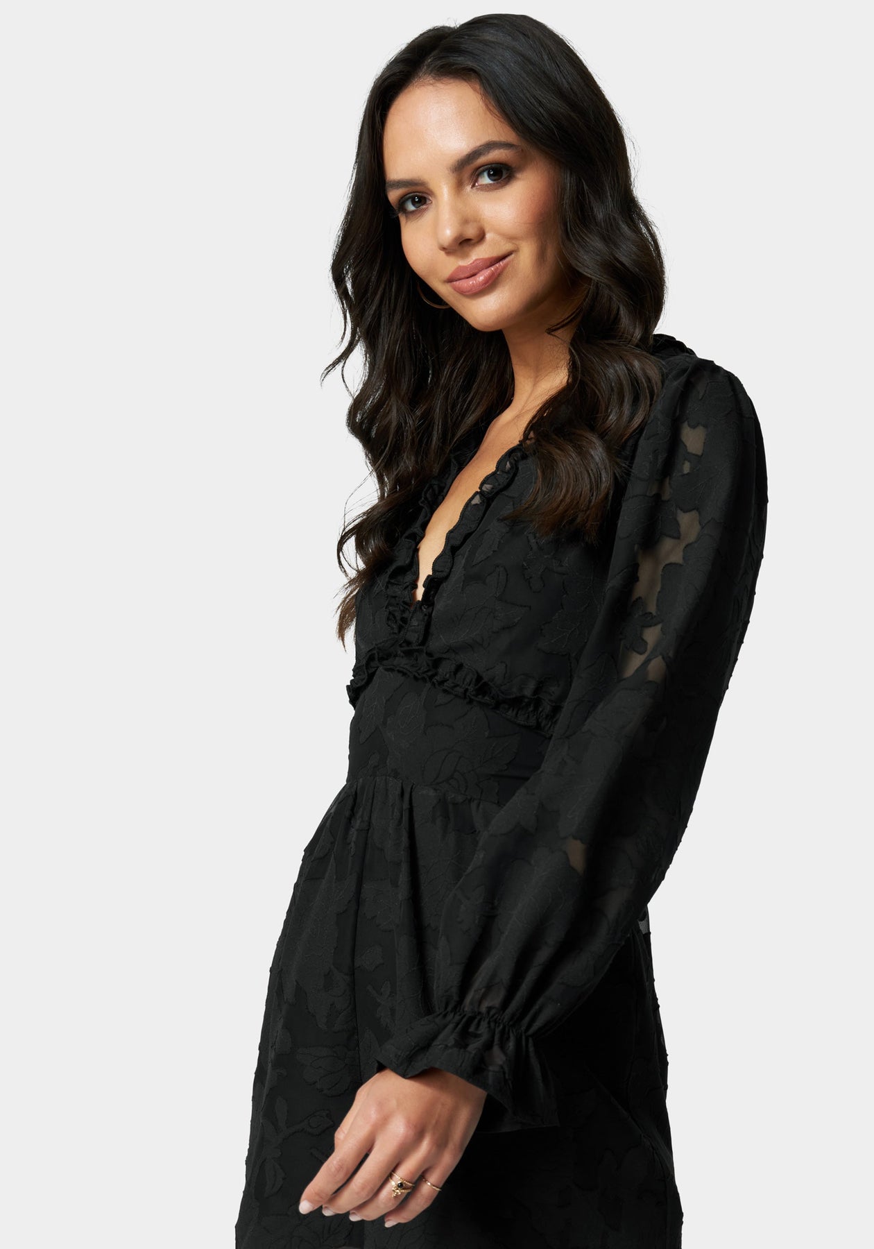 Summer soiree ready. This romper features allover floral lace, an open back with a self-tie, ruffle trim, and long puff sleeves for a romantic look.