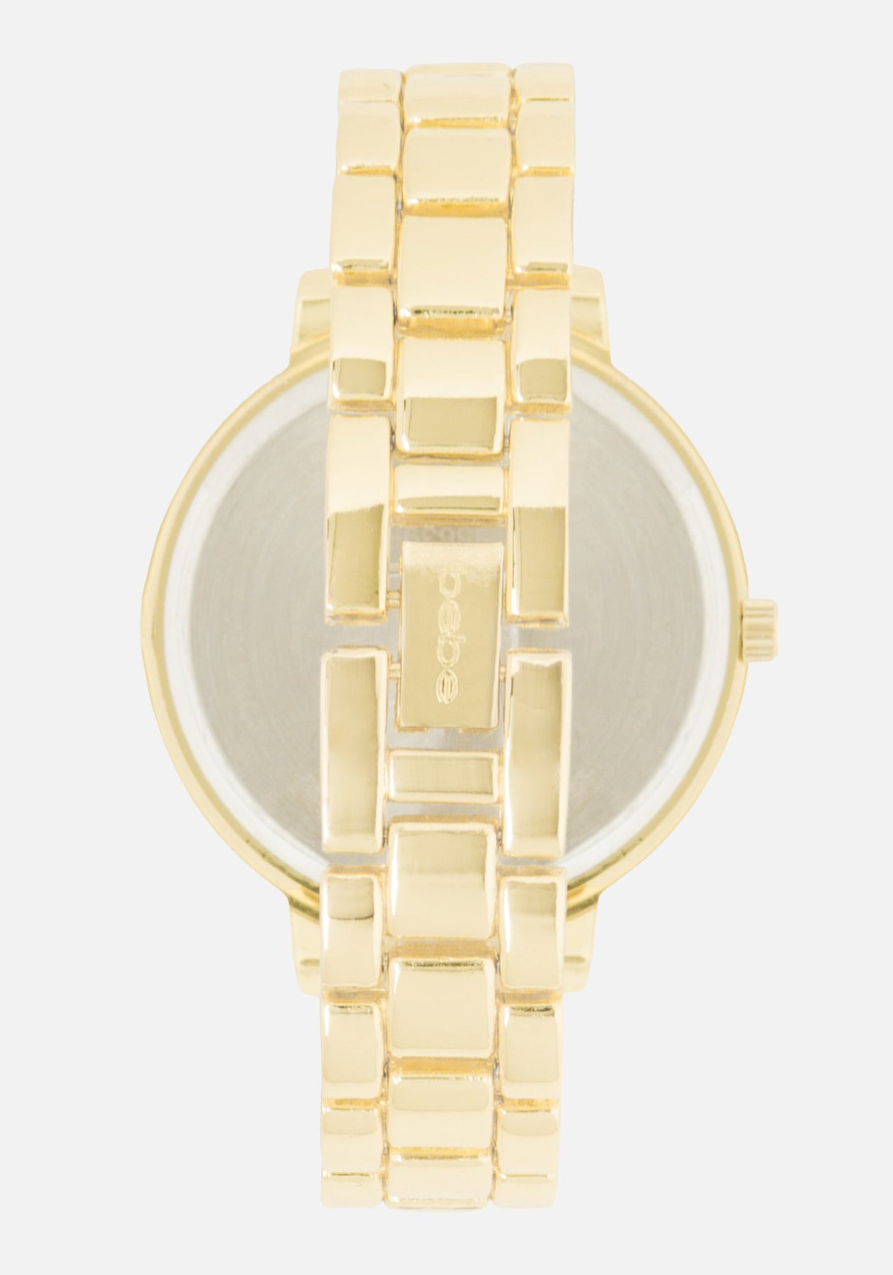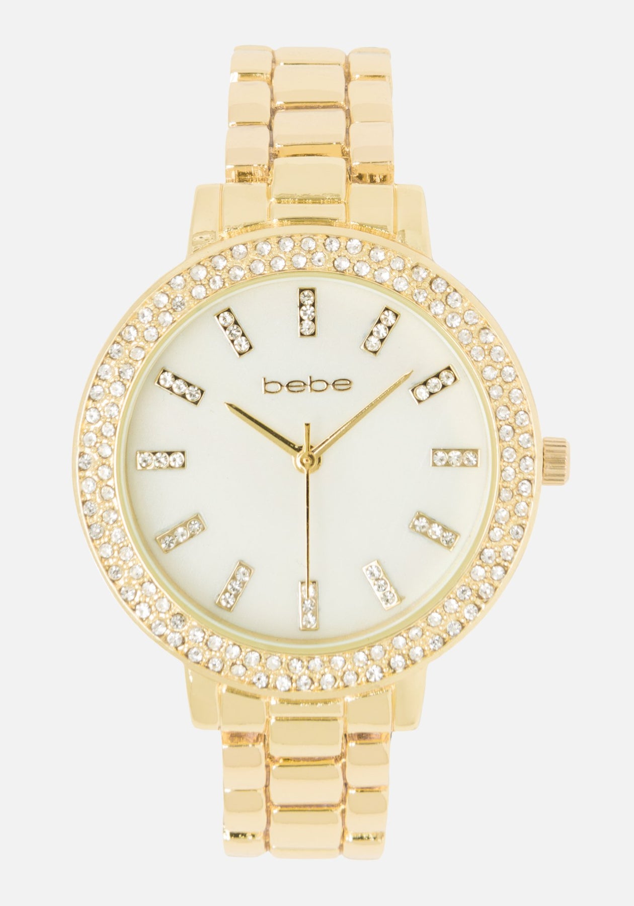A perfect complement to your power looks, this weighty goldtone watch is encrusted with shimmery crystals and has a luminous pearl-look dial. Includes 3-hand styling and a discreet bebe logo.