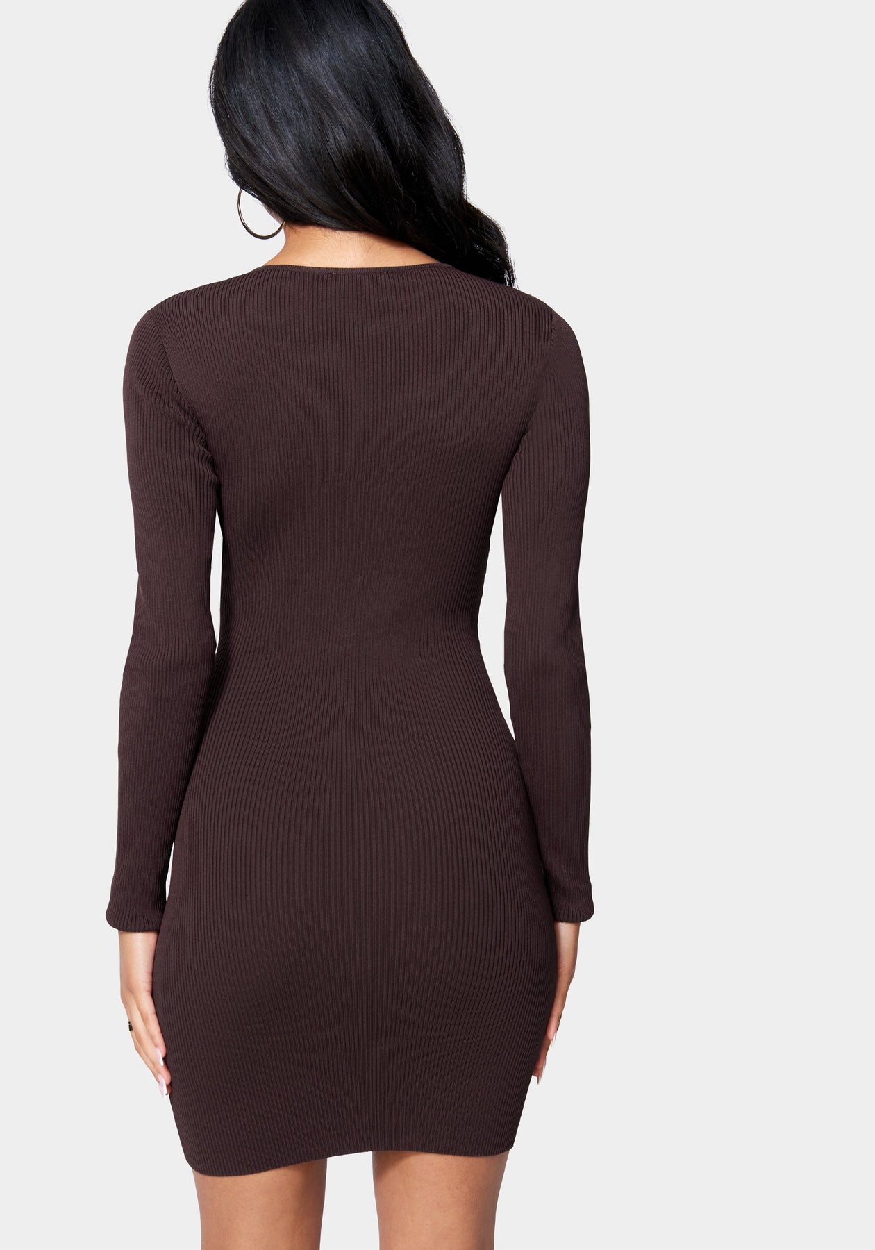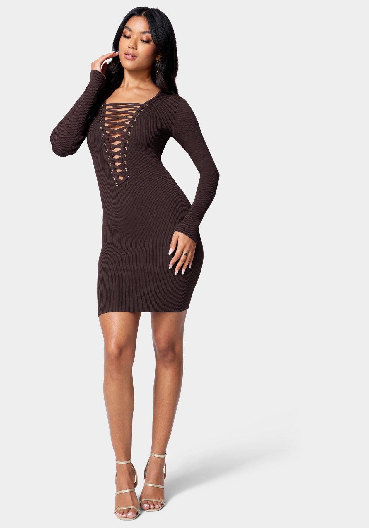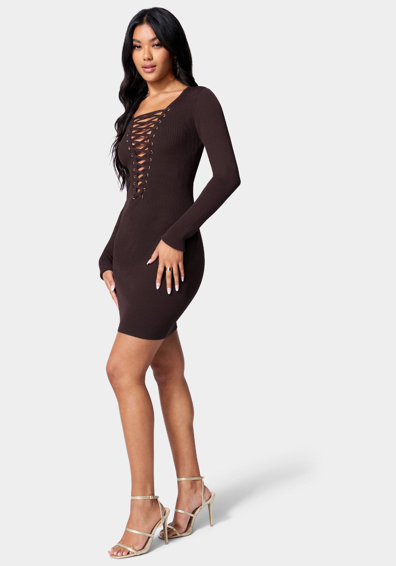 Take the plunge this season. This curve-enhancing ribbed Lace-Up Sweater Dress features a sexy deep V-neck and long sleeves.
