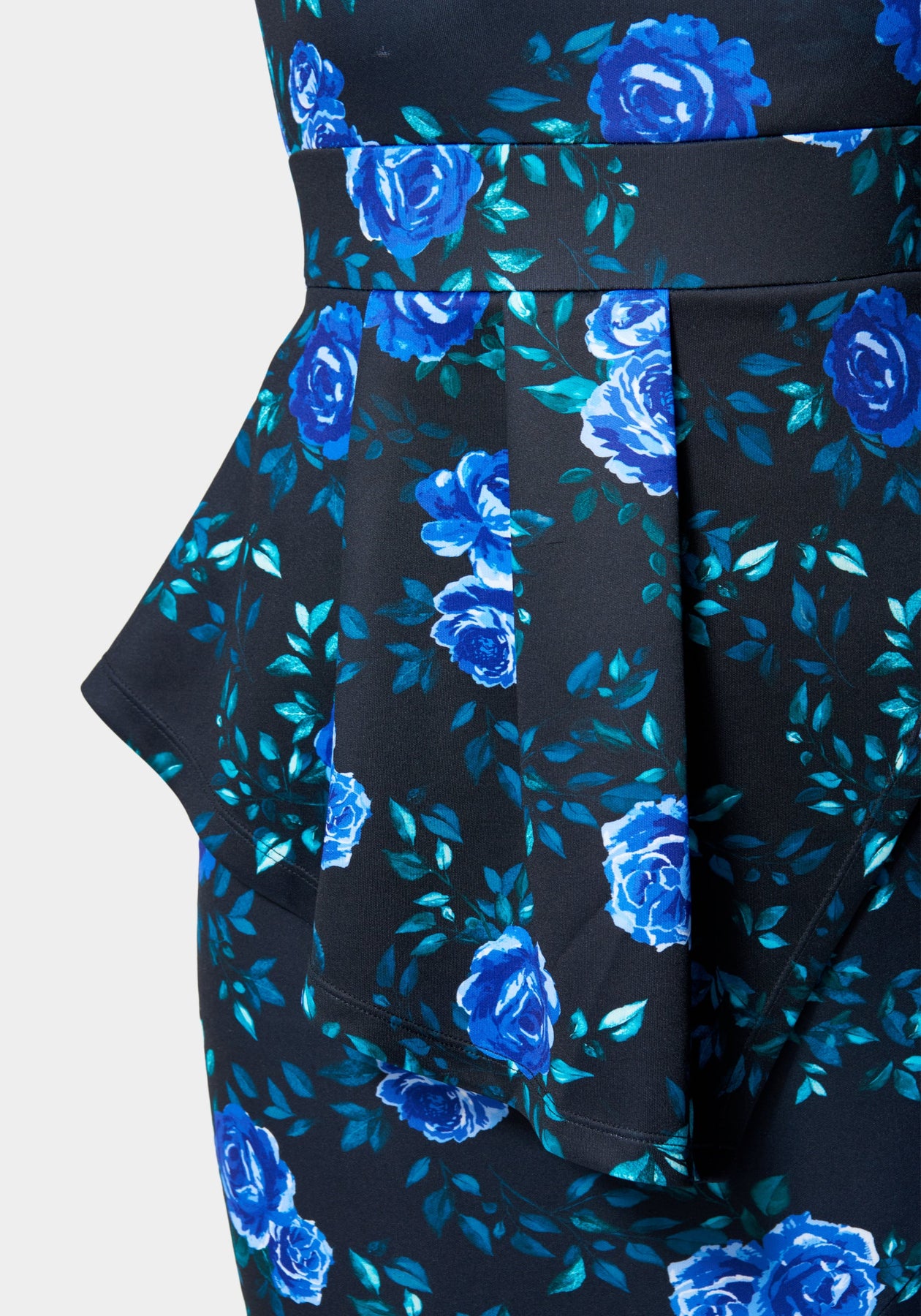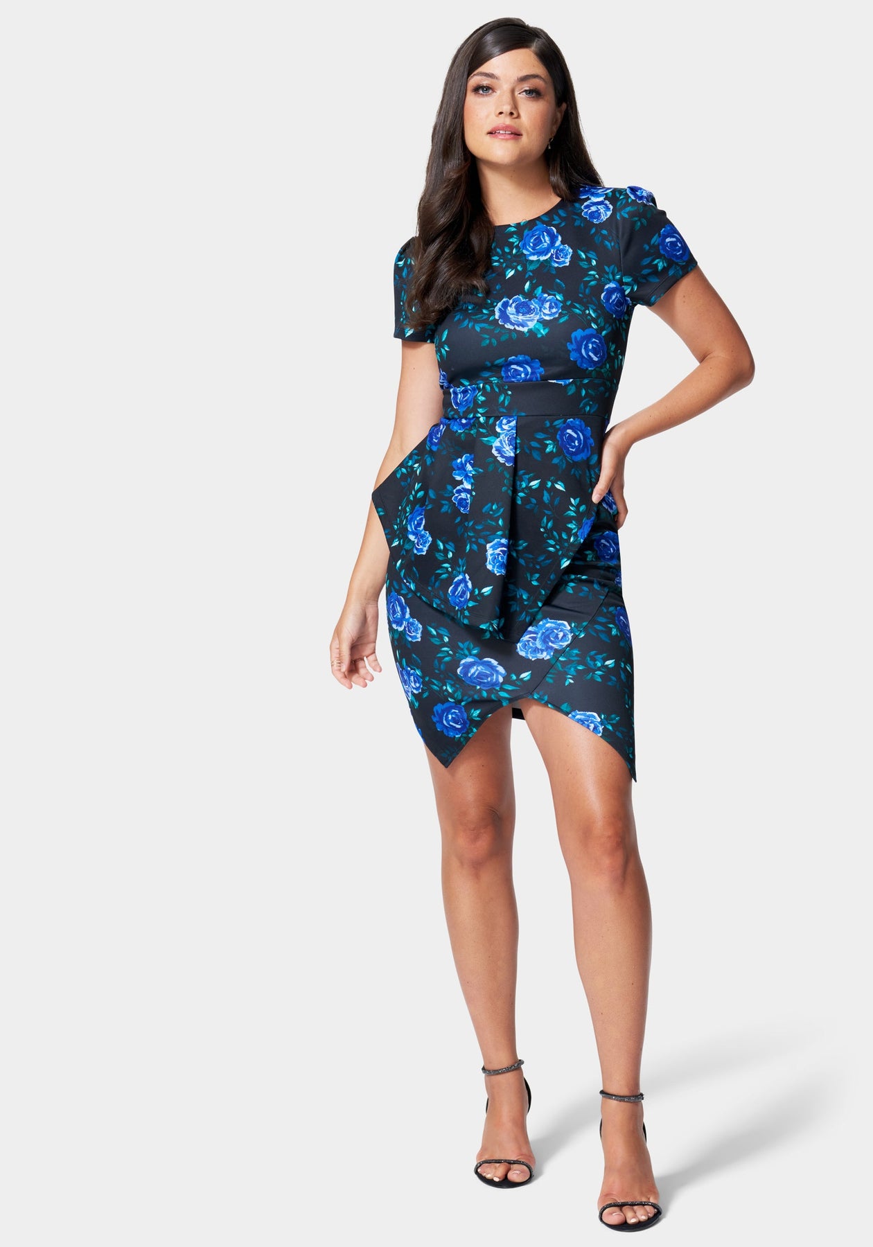 Fall florals. Embrace the season in a stretch knit dress featuring an allover rose print, cap sleeves, and a gathered detail at the waist.