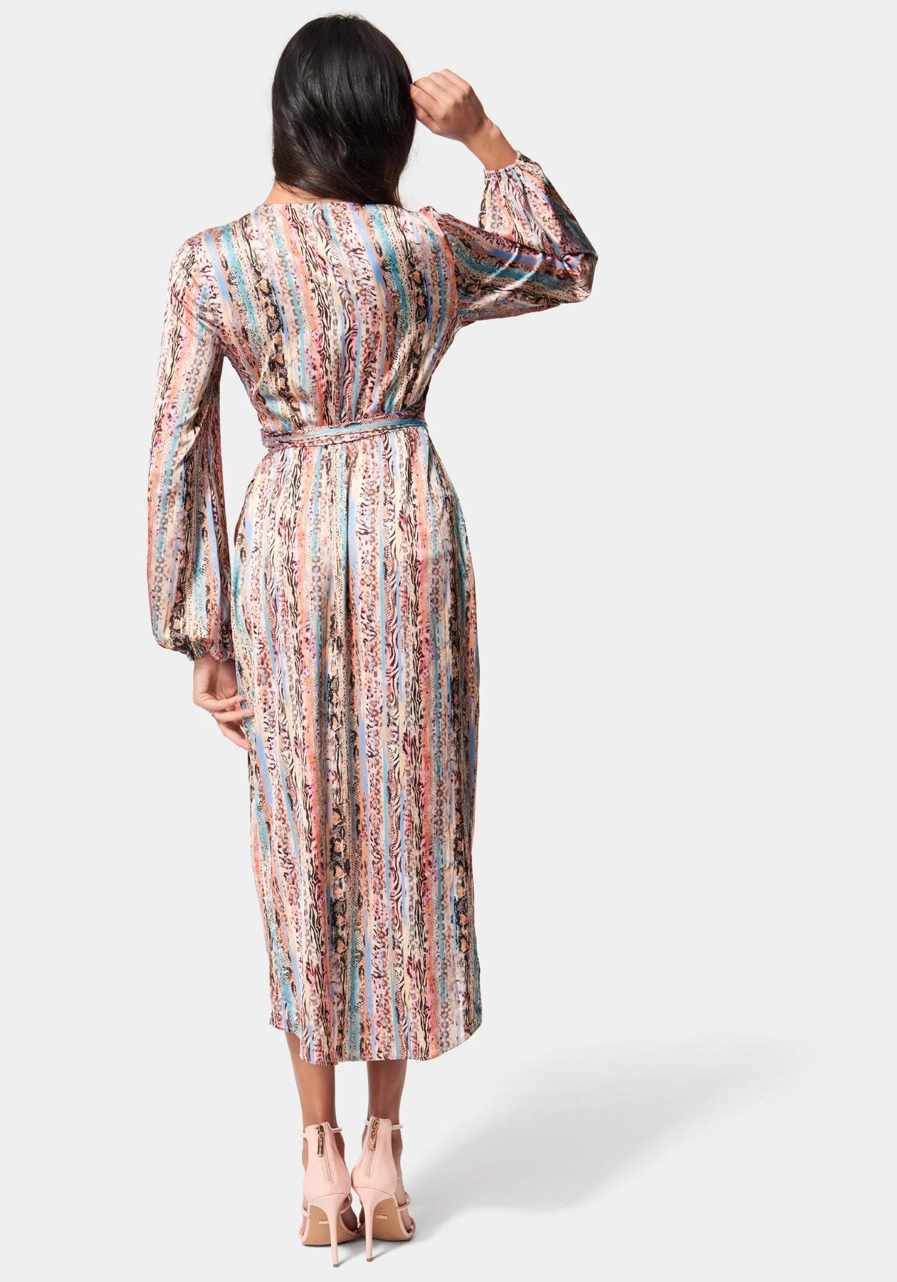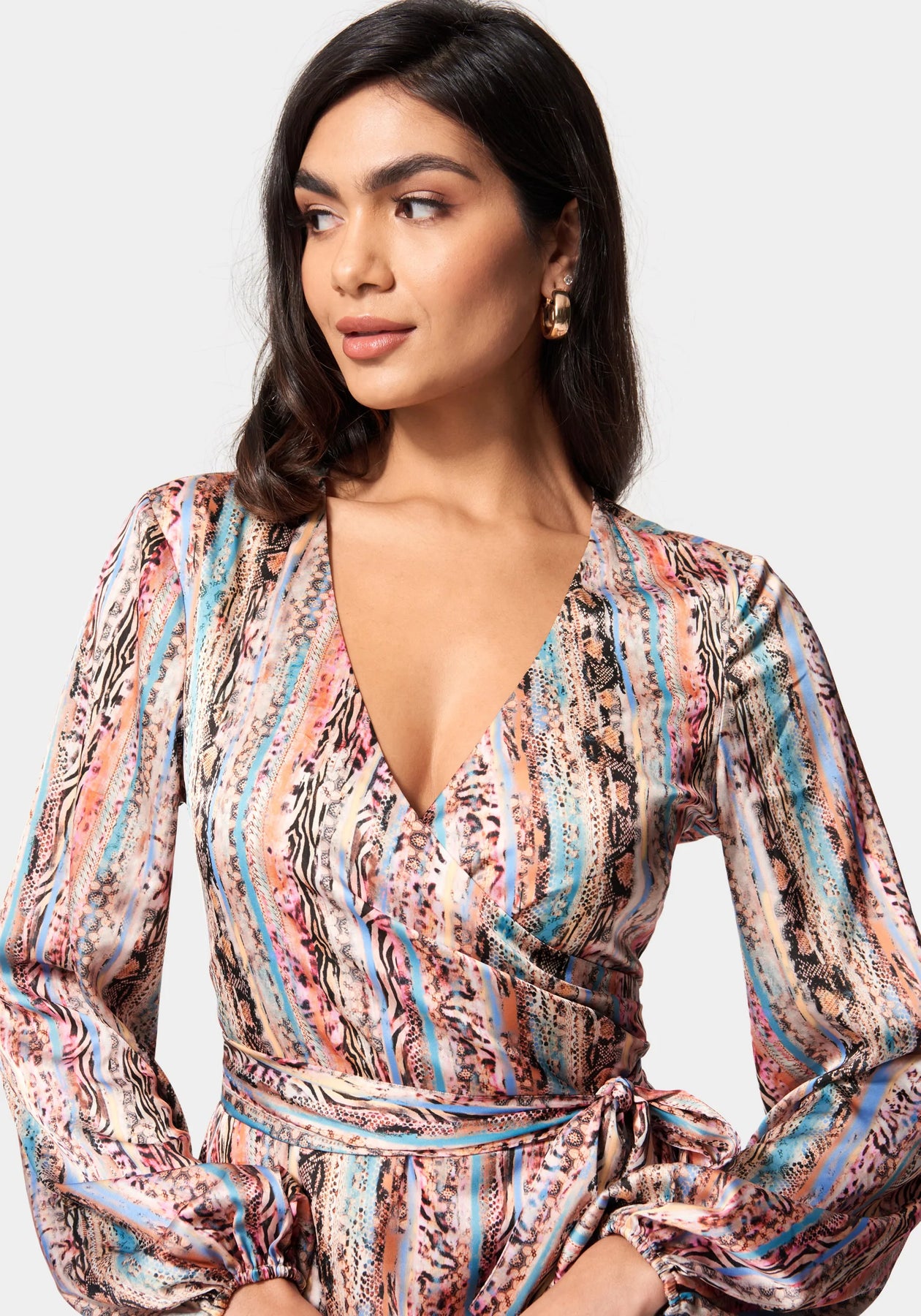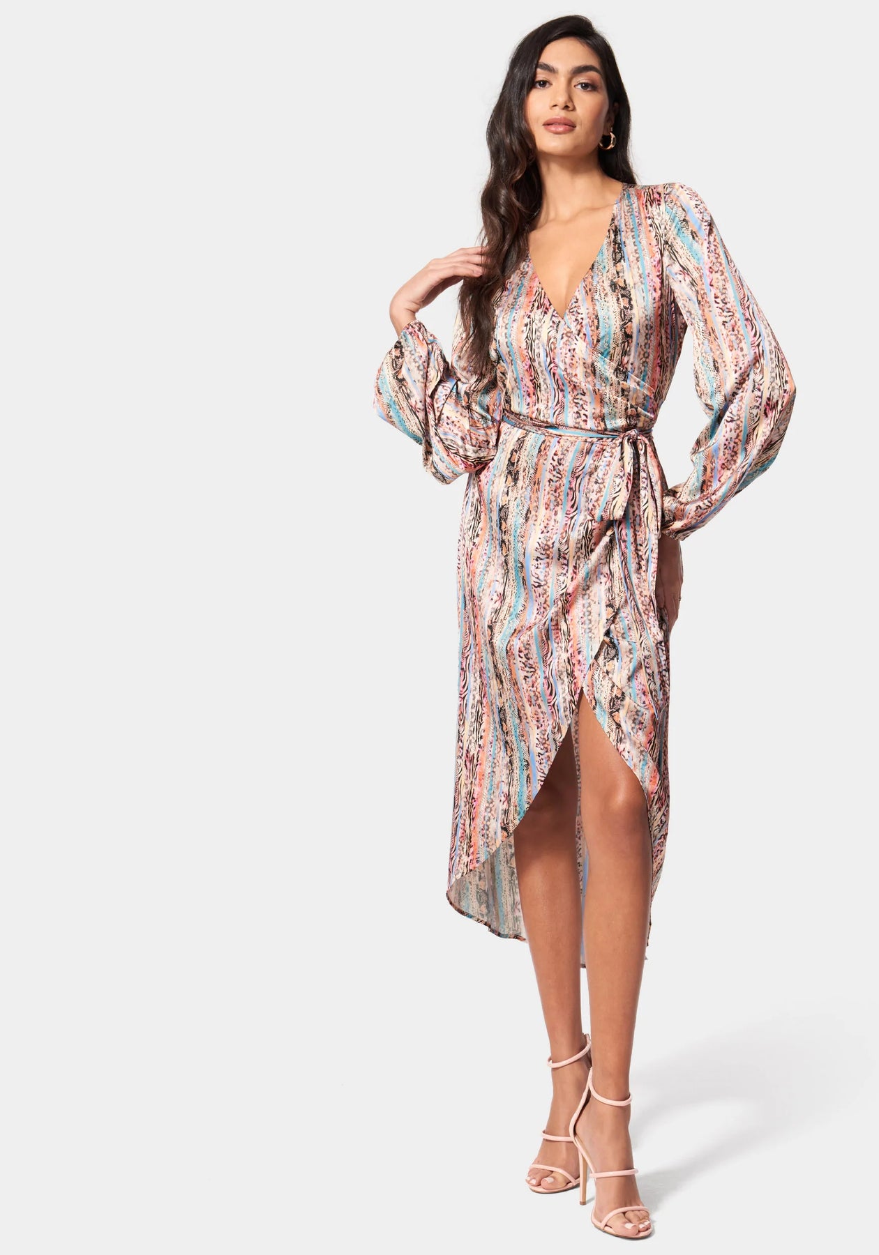A stunning glossy satin wrap dress framed by voluminous sleeves. Featuring an exotic allover print and a high-low hem that's perfect for day to night affairs. Pair with your highest heels for an unforgettable look.