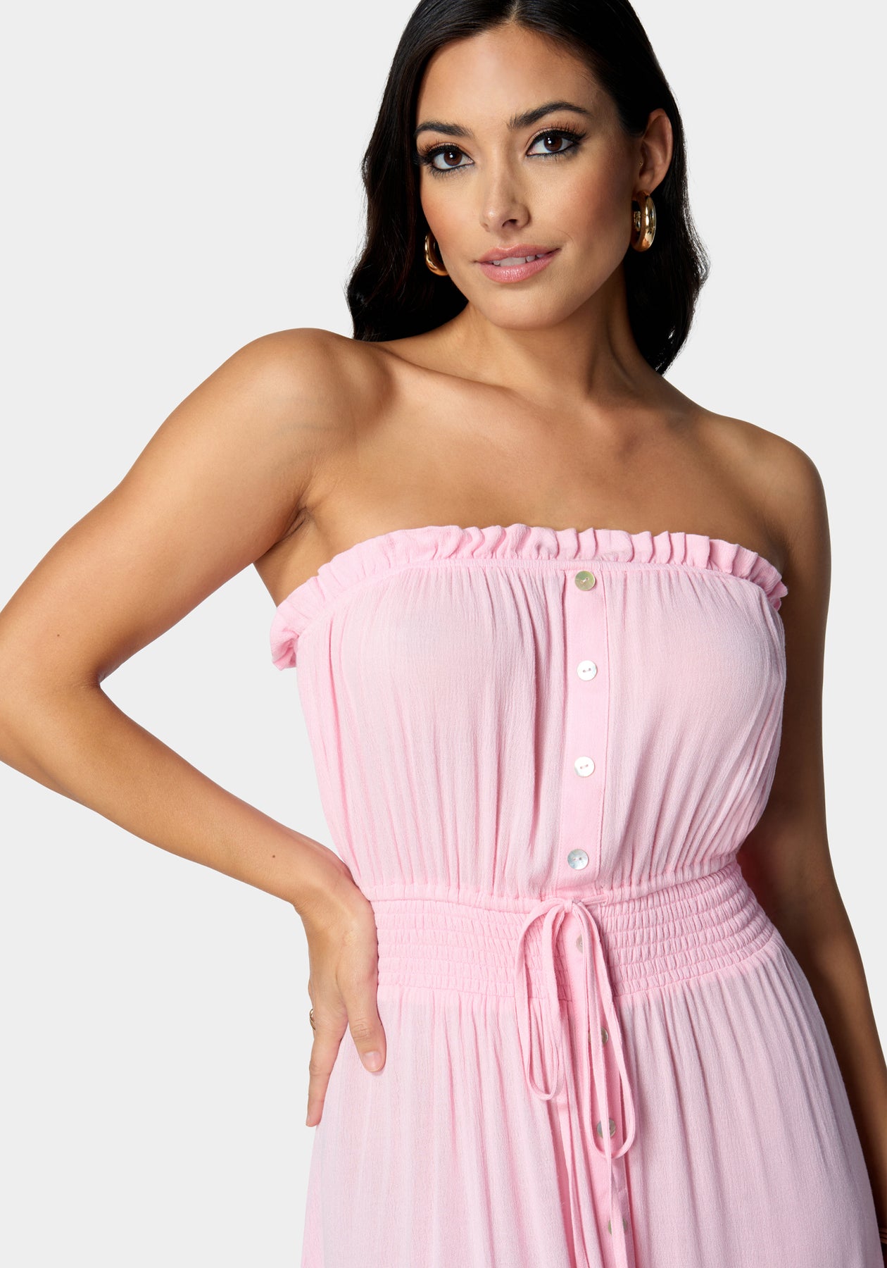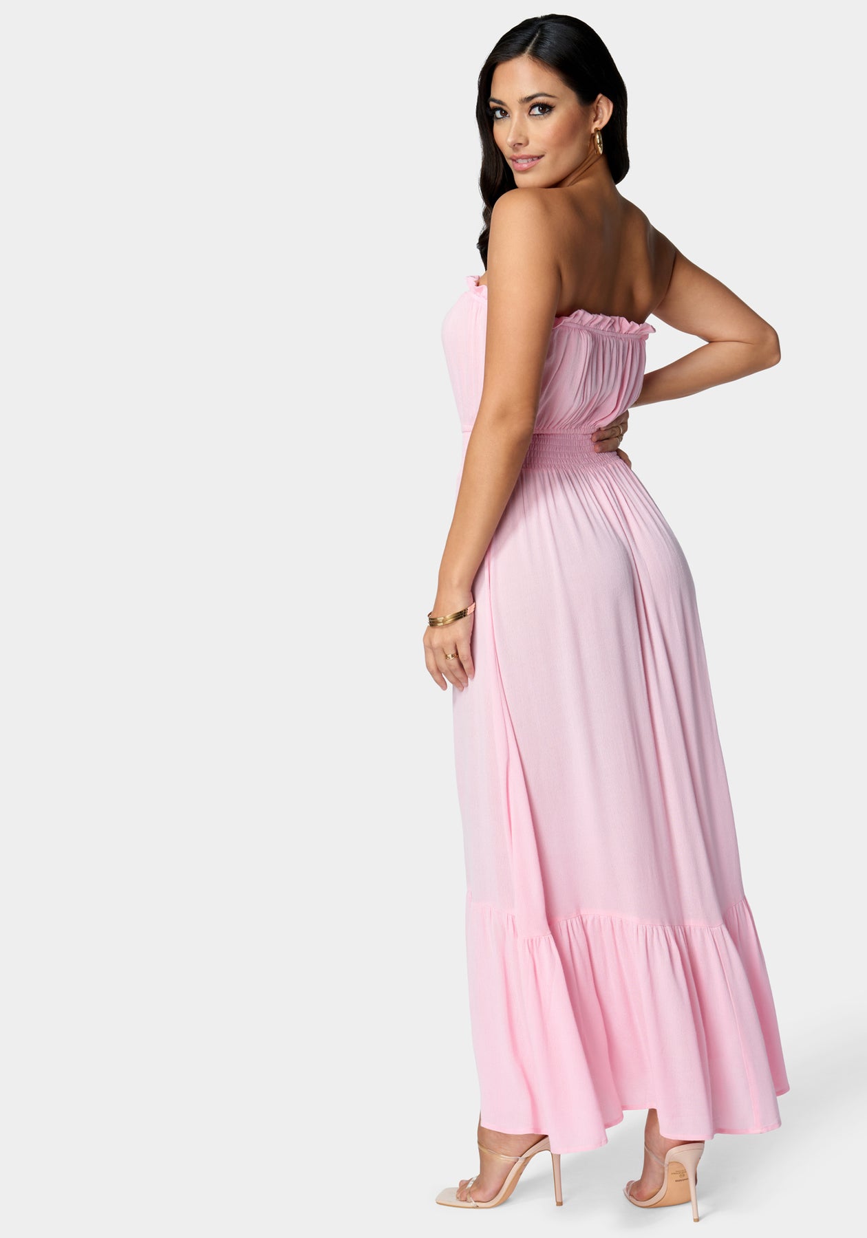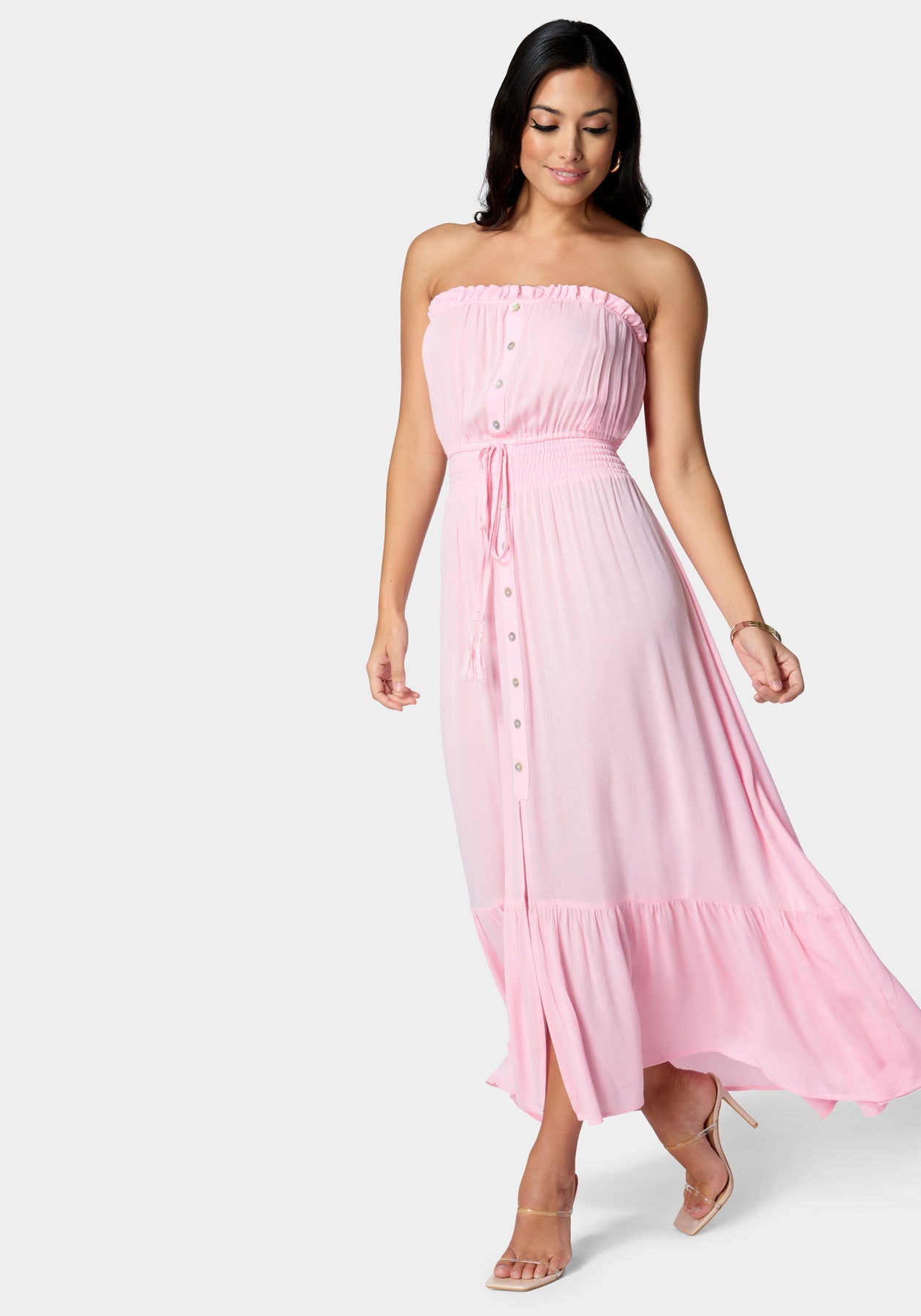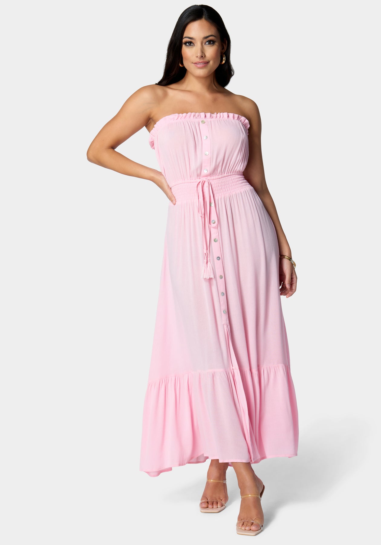 Add a touch of bohemian style to your wardrobe with a strapless maxi dress. An elasticized waistband and smocked waist provide an effortlessly flattering fit. Throw it on over your bathing suit or pair it with caged sandals and stacked jewels for a gorgeous look that's ideal for summer.